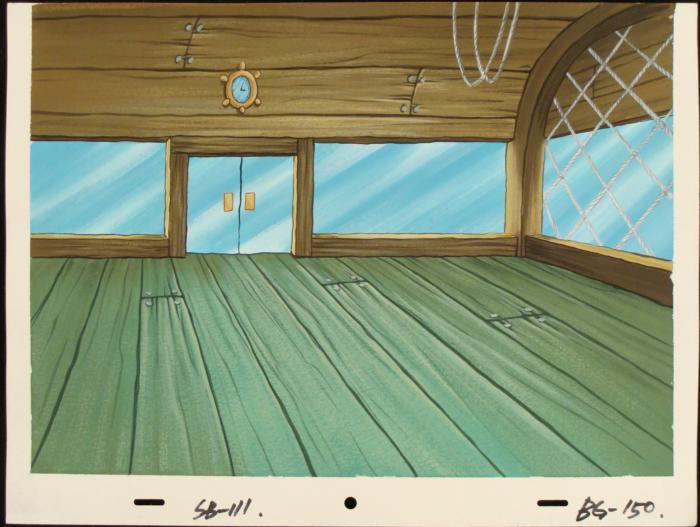 This original hand-painted background from the Nickelodeon TV show SpongeBob Squarepants. The story takes place under the deep blue sea in Bikini Bottom, where SpongeBob resides. SpongeBob, who is a yellow, porous sponge, is your typical happy-go-lucky character, as he is always cheerful and enjoys making people laugh. Patrick Star, SpongeBob's neighbor who is a starfish, is your average children's show idiot, as he boasts knowing nothing and is often getting himself into ridiculous situations. Between the homes of these two lies the home of the miserable Squidward, a squid, who is known for being grouchy and playing tricks on SpongeBob and Patrick. Both SpongeBob and Squidward work at the Krusty Krab, a fast food business run by the greedy money-loving Mr. Krabs, a crab, the arch rival of the evil, possibly misunderstood, Plankton. Another neighbor, Sandy Cheeks, an athletic squirrel who normally wears an astronaut's space suit, was introduced in "Tea at the Treedome." She spends most of her time inventing and experimenting. Where are all the tables?Original Production Background Overall Size of Background: 10 1/2" x 13 1/2" Very good conditionOriginal Production Backgrounds are used in the making of the final version of animated productions. The background establishes the location and the overall good mood of the scenee. Typically, a background layout artist creates a drawing to establish the content of the scene, placement of characters, perspective and camera angle. Based on this drawing, the background artist creates a preliminary painting to confirm all of the scenes details, then the final production background which is used in the filming of the scene. When these backgrounds are individually photographed behind the progression of production cels, and projected at a rapid succession, the images in the foreground appear to move, creating an animated scene. The background is ready to be matted and framed. It is a colored background with the animator's notations at the bottom.
