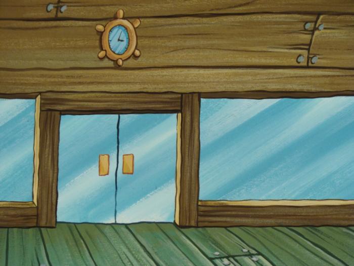 This original hand-painted background from the Nickelodeon TV show SpongeBob Squarepants. The story takes place under the deep blue sea in Bikini Bottom, where SpongeBob resides. SpongeBob, who is a yellow, porous sponge, is your typical happy-go-lucky character, as he is always cheerful and enjoys making people laugh. Patrick Star, SpongeBob's neighbor who is a starfish, is your average children's show idiot, as he boasts knowing nothing and is often getting himself into ridiculous situations. Between the homes of these two lies the home of the miserable Squidward, a squid, who is known for being grouchy and playing tricks on SpongeBob and Patrick. Both SpongeBob and Squidward work at the Krusty Krab, a fast food business run by the greedy money-loving Mr. Krabs, a crab, the arch rival of the evil, possibly misunderstood, Plankton. Another neighbor, Sandy Cheeks, an athletic squirrel who normally wears an astronaut's space suit, was introduced in "Tea at the Treedome." She spends most of her time inventing and experimenting. Where are all the tables?Original Production Background Overall Size of Background: 10 1/2" x 13 1/2" Very good conditionOriginal Production Backgrounds are used in the making of the final version of animated productions. The background establishes the location and the overall good mood of the scenee. Typically, a background layout artist creates a drawing to establish the content of the scene, placement of characters, perspective and camera angle. Based on this drawing, the background artist creates a preliminary painting to confirm all of the scenes details, then the final production background which is used in the filming of the scene. When these backgrounds are individually photographed behind the progression of production cels, and projected at a rapid succession, the images in the foreground appear to move, creating an animated scene. The background is ready to be matted and framed. It is a colored background with the animator's notations at the bottom.