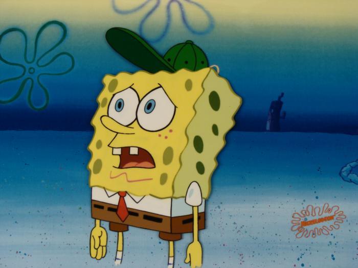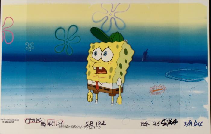 This animation cel and reproduction background are from the Nickelodeon TV show SpongeBob Squarepants. The story takes place under the deep blue sea in Bikini Bottom, where SpongeBob resides. SpongeBob, who is a yellow, porous sponge, is your typical happy-go-lucky character, as he is always cheerful and enjoys making people laugh. Patrick Star, SpongeBob's neighbor who is a starfish, is your average children's show idiot, as he boasts knowing nothing and is often getting himself into ridiculous situations. Between the homes of these two lies the home of the miserable Squidward, a squid, who is known for being grouchy and playing tricks on SpongeBob and Patrick. Both SpongeBob and Squidward work at the Krusty Krab, a fast food business run by the greedy money-loving Mr. Krabs, a crab, the arch rival of the evil, possibly misunderstood, Plankton. Another neighbor, Sandy Cheeks, an athletic squirrel who normally wears an astronaut's space suit, was introduced in "Tea at the Treedome." She spends most of her time inventing and experimenting. There is something missing in the background. Original Printed Background and Animated Cel Overall Size of Background: 10 1/2" x 17" Overall Size of the Cel: 10 1/2" x 12 1/2" Very good condition This is an original hand-painted cel set-up used in the production of an episode of "SpongeBob SquarePants." Each one-of-a-kind set-up represents a slight change in position of the characters. When individually photographed and projected in rapid succession, the images appear to move.