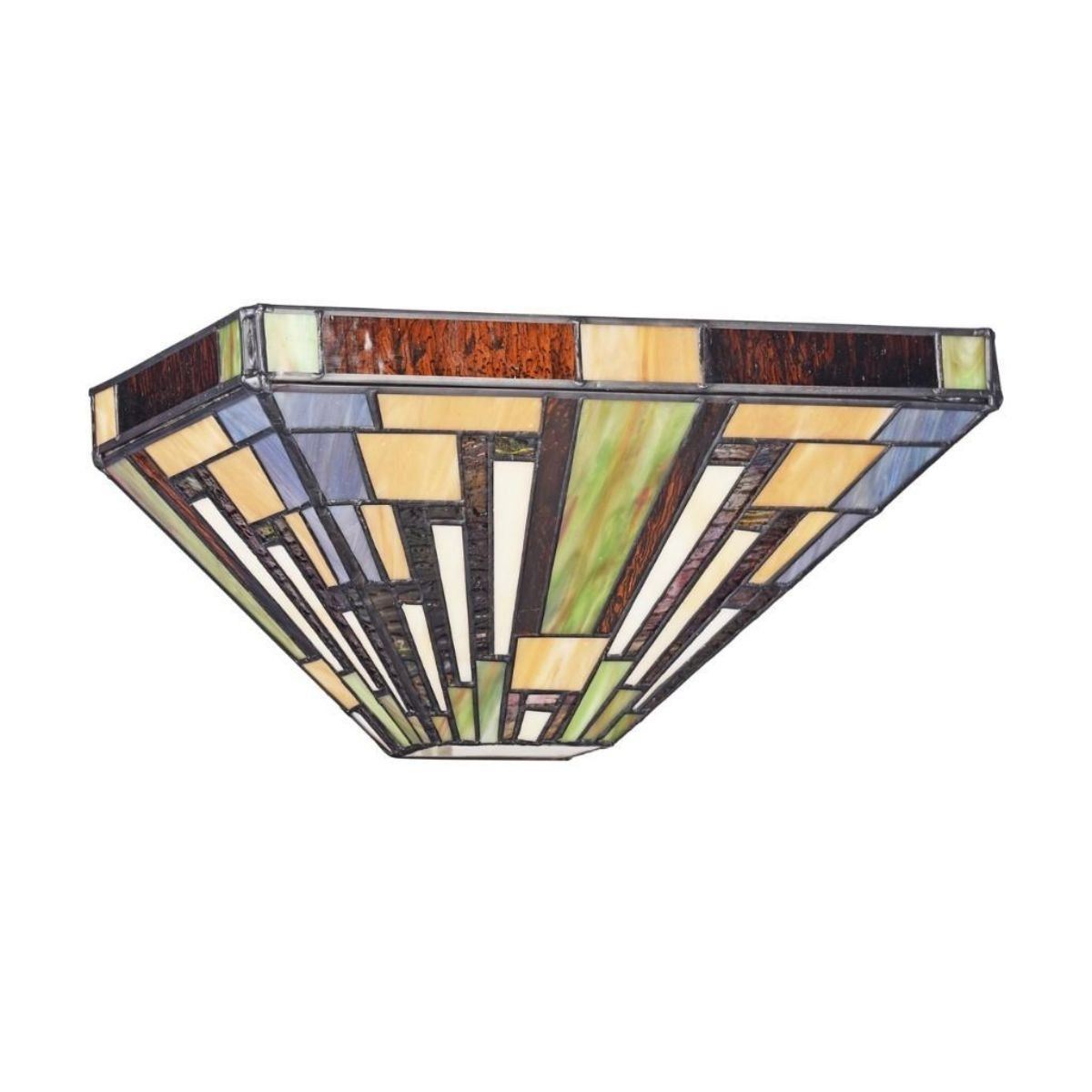 MERTON, a Mission style 1 light wall sconce features a beautiful, timeless design, consisting of firey colors; orange, red, yellow and light brown. This piece is hand crafted from over 100 pieces of hand cut, stained art glass. Handcrafted using the same techniques that were developed by Louis Comfort Tiffany in the early 1900s, this beautiful Tiffany-style piece contains hand-cut pieces of stained glass, each wrapped in fine copper foil. Net Weight (lbs)2.4 Overall Width12.2" Overall Height5.7" Est. Glass BeadsN/A Est. Glass Cuts101pcs Est. Glass CrystalsN/A Glass Thickness.12" Shade Width6.1" Shade MaterialsTiffany-glass Back Plate Height4.3" Back Plate Width6.1" Projection6.1" Electric Wire Length8" Shade ShapeSquare Specific UsesIndoor Wattage/Bulb Types(1) 60 Watt E26 Type A Bullb (not included) FinishTextured Black Light DirectionUplight Overall MaterialsGlass, metal & electrical components Switch TypeWall Outlet Power SourceHardwired, Wall Outlet