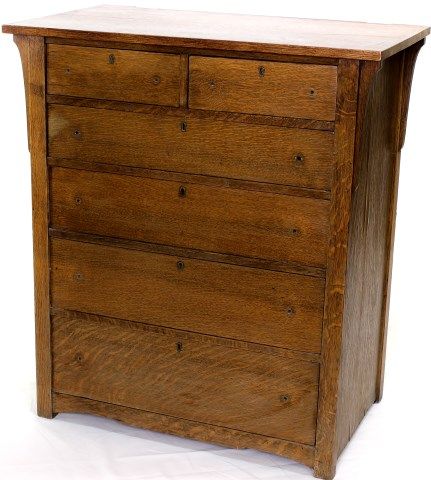 with 2 over 4 drawers, good solid condition, missing mirror and hardware. Easy project if you need an Arts & Crafts dresser, 33" X 38". Est. 250-450