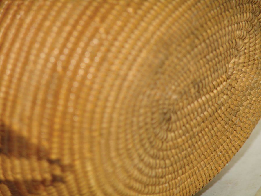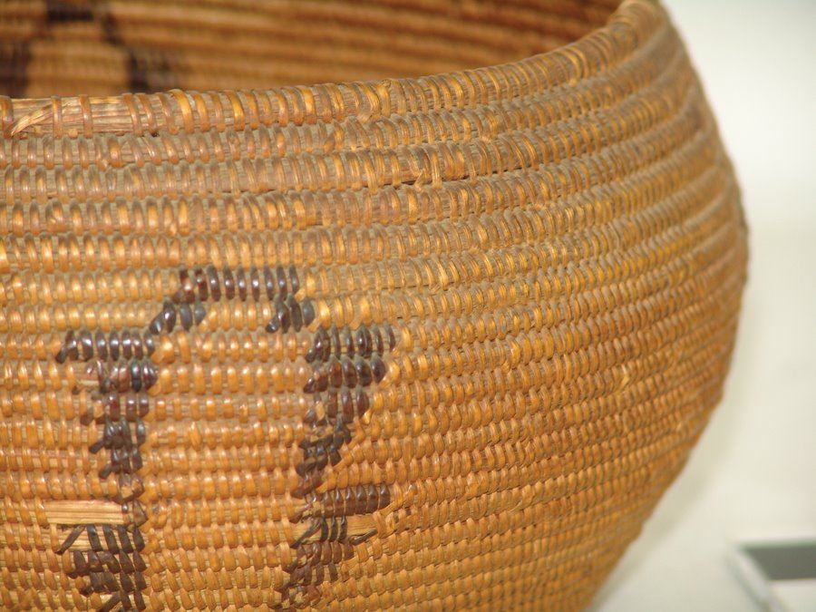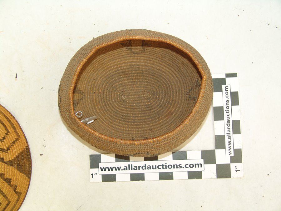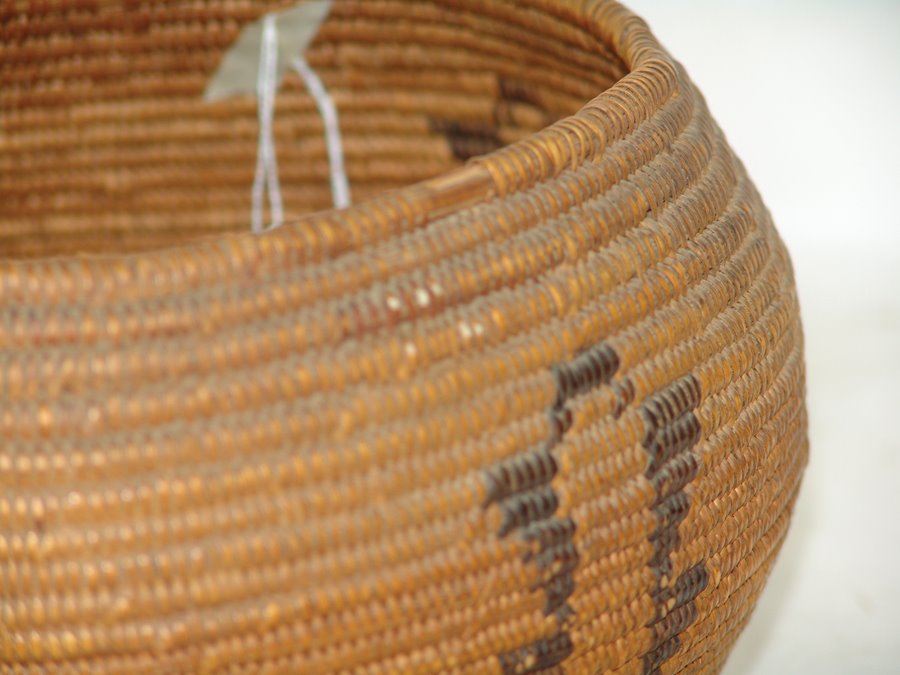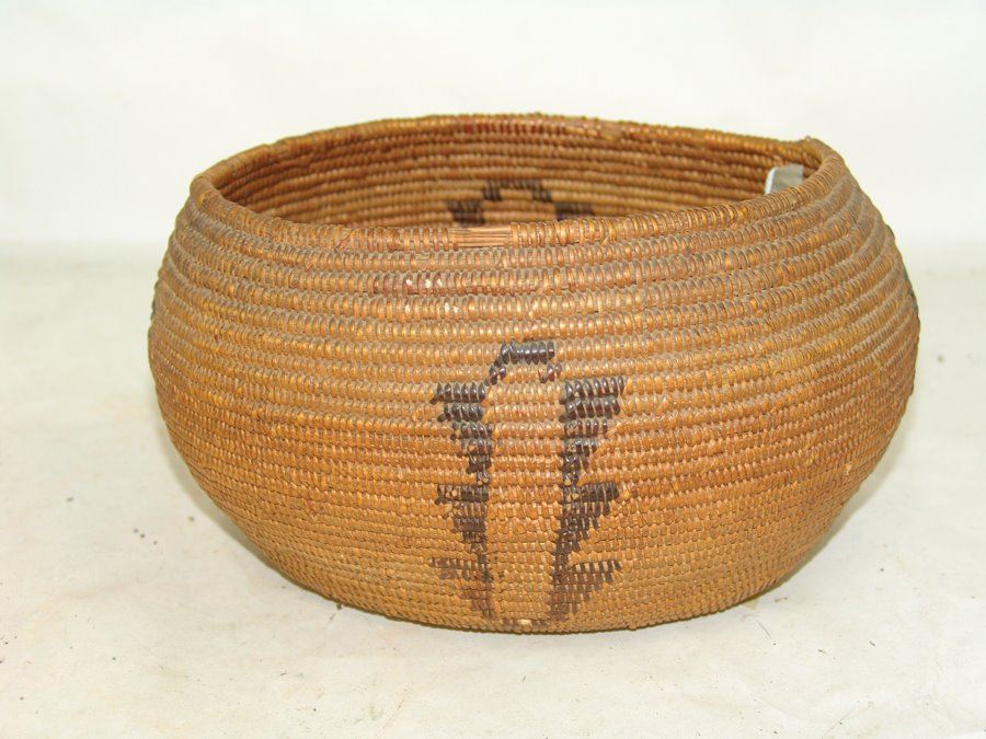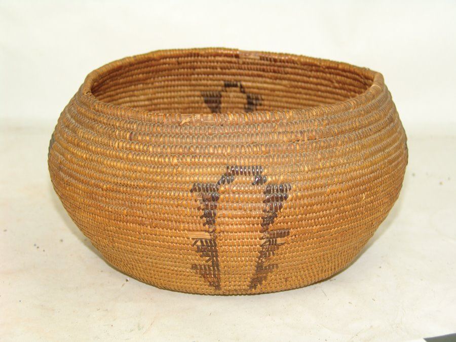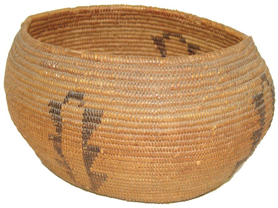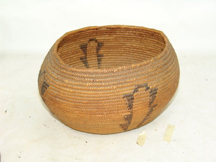 Very old, rounded, oval shaped bowl with simple stacked arrow point symbols. Good condition, a few missing rim stitches. Great darkened patina.,,5" x 7-1/2" x 10"