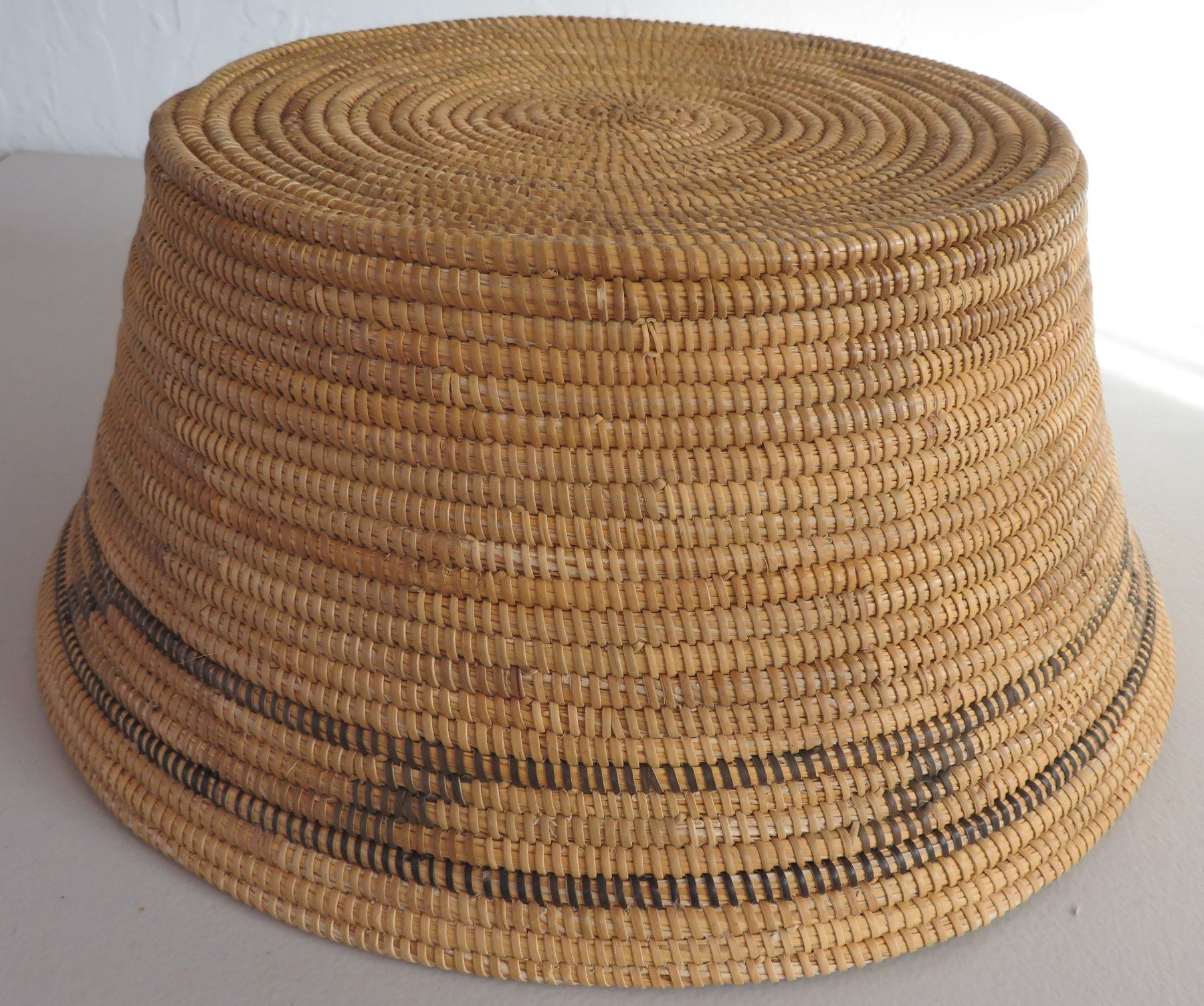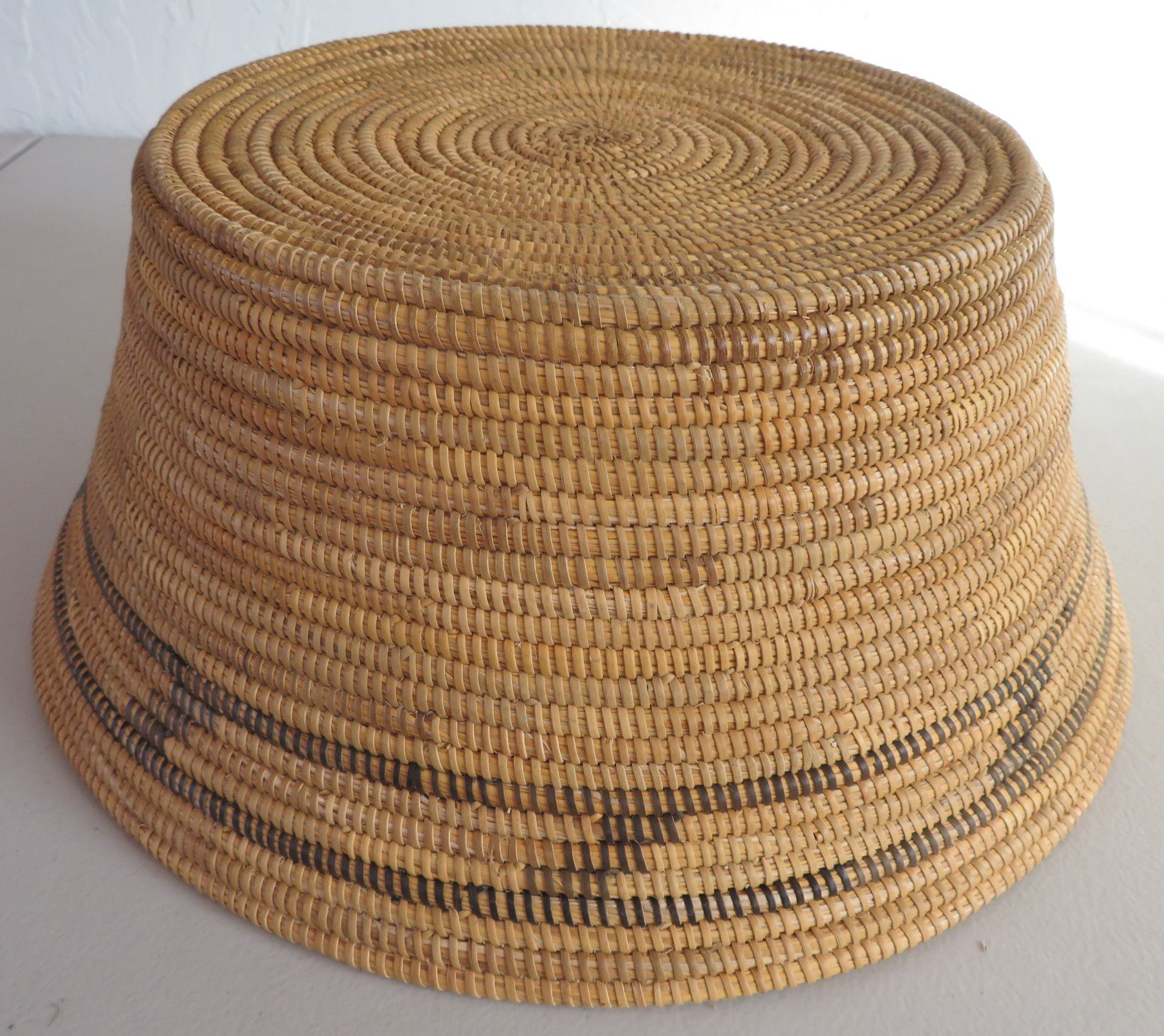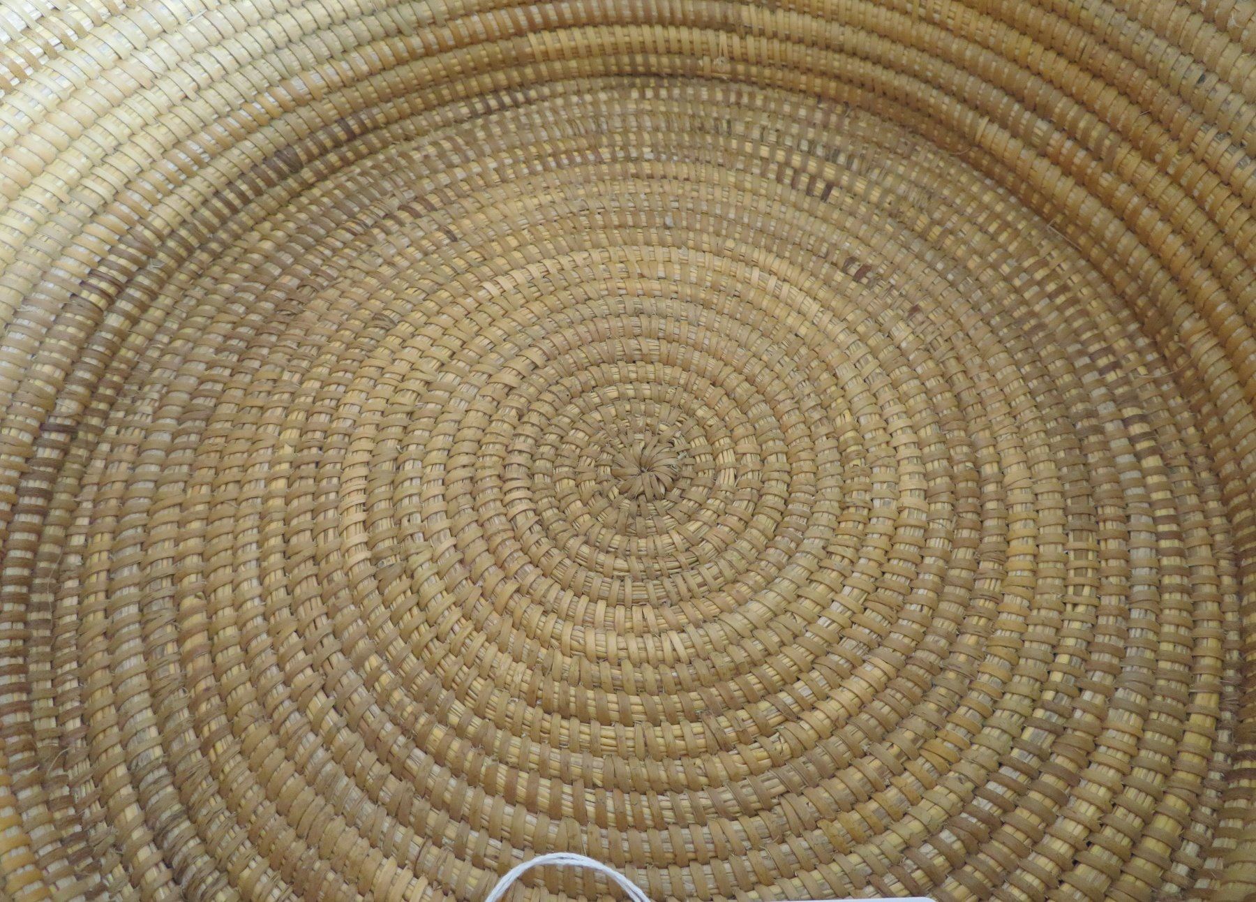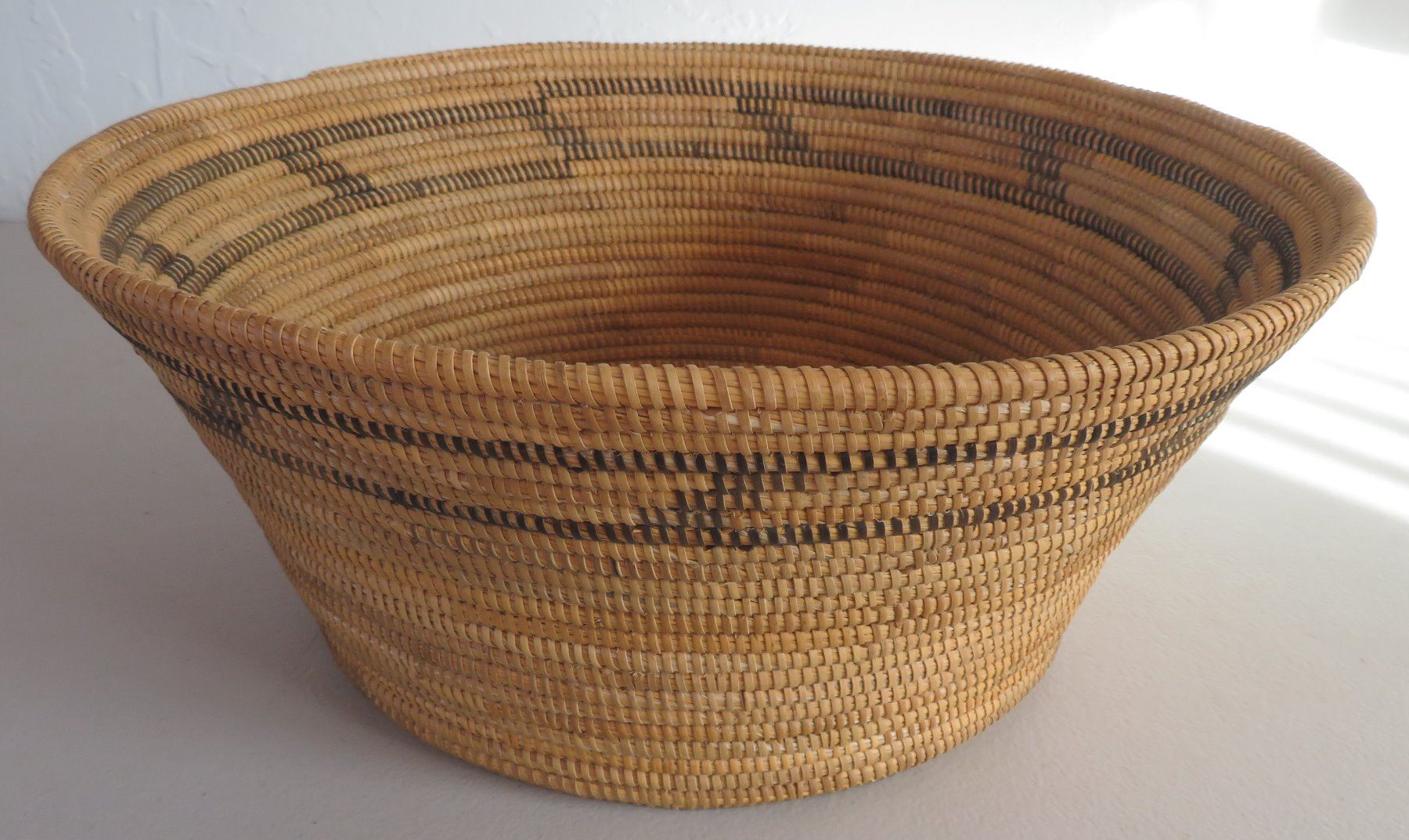 Mission Basket, c. 1940s. Made of juncus, the item measures 15 1/2" x 6 1/2". San Diego County, California. Condition: Good, see images. Shipping: $50.00 w/insurance and signature, due to size and value.