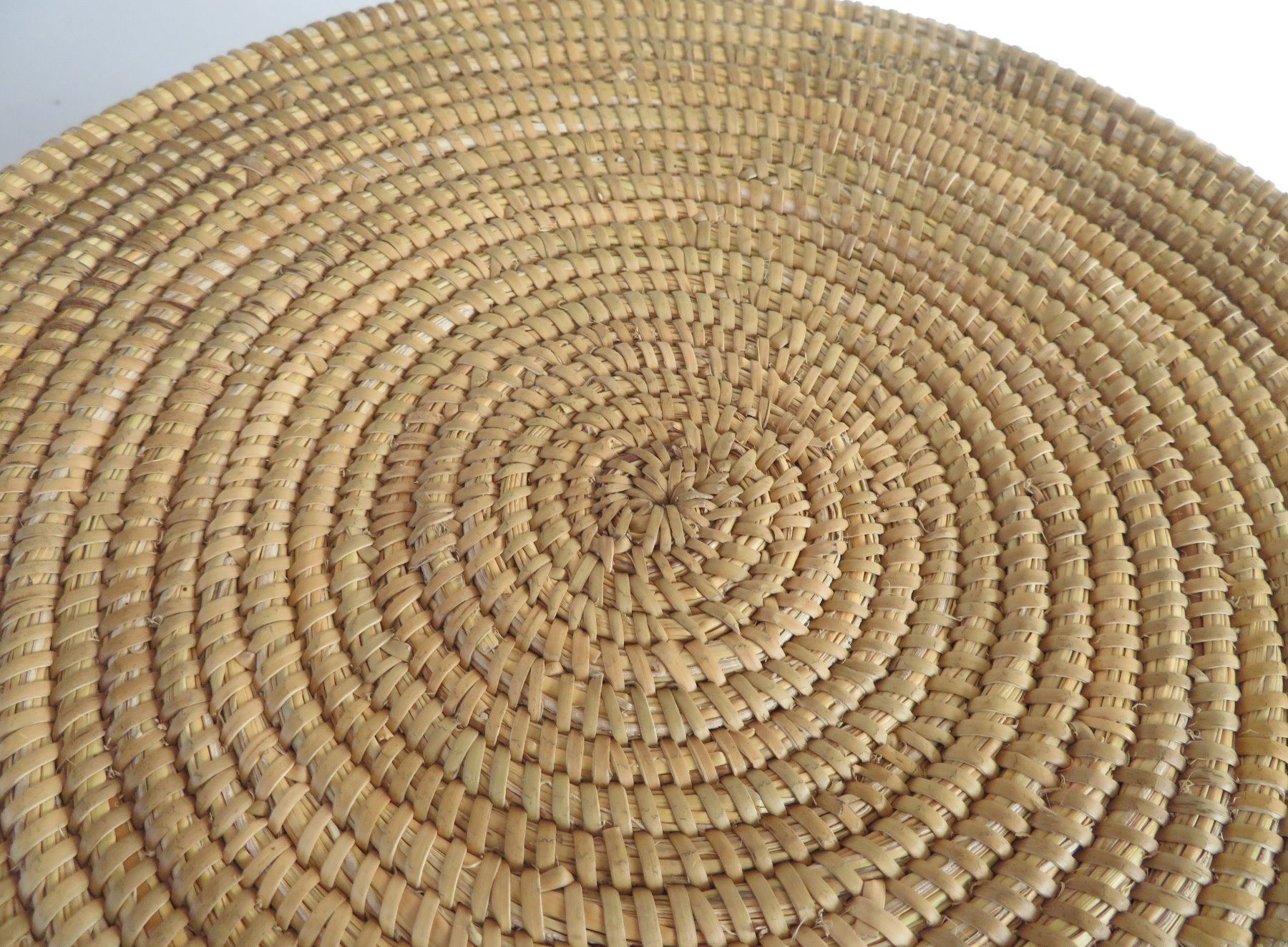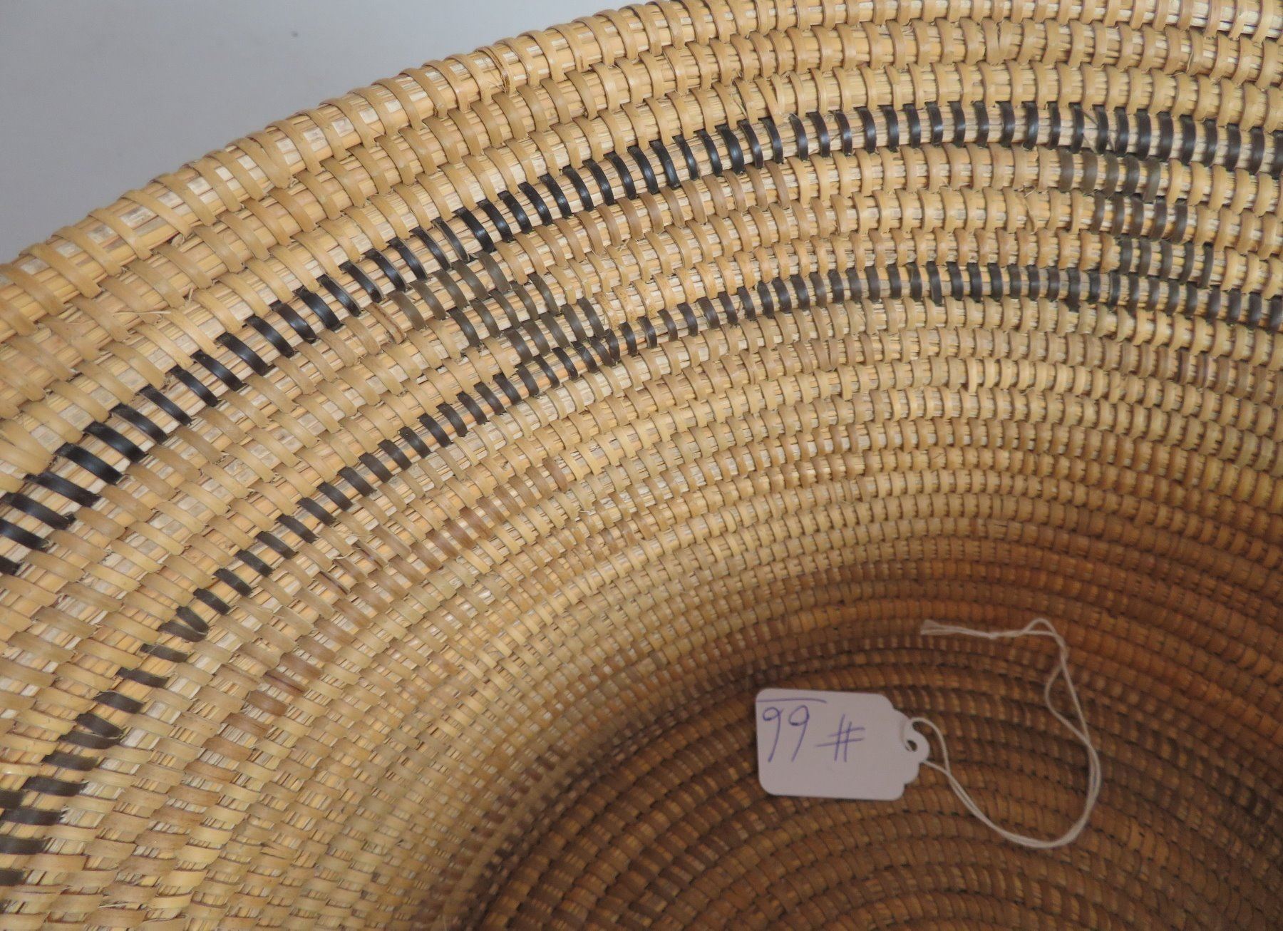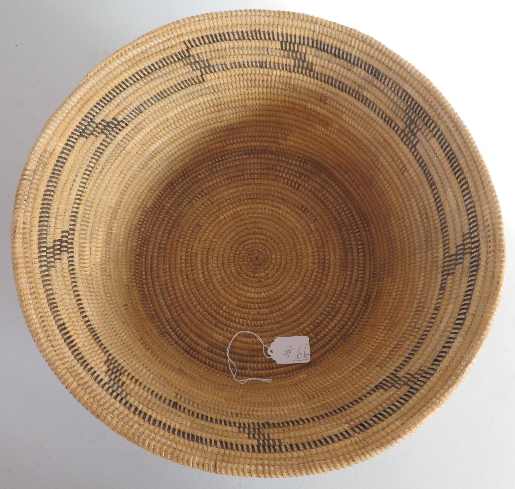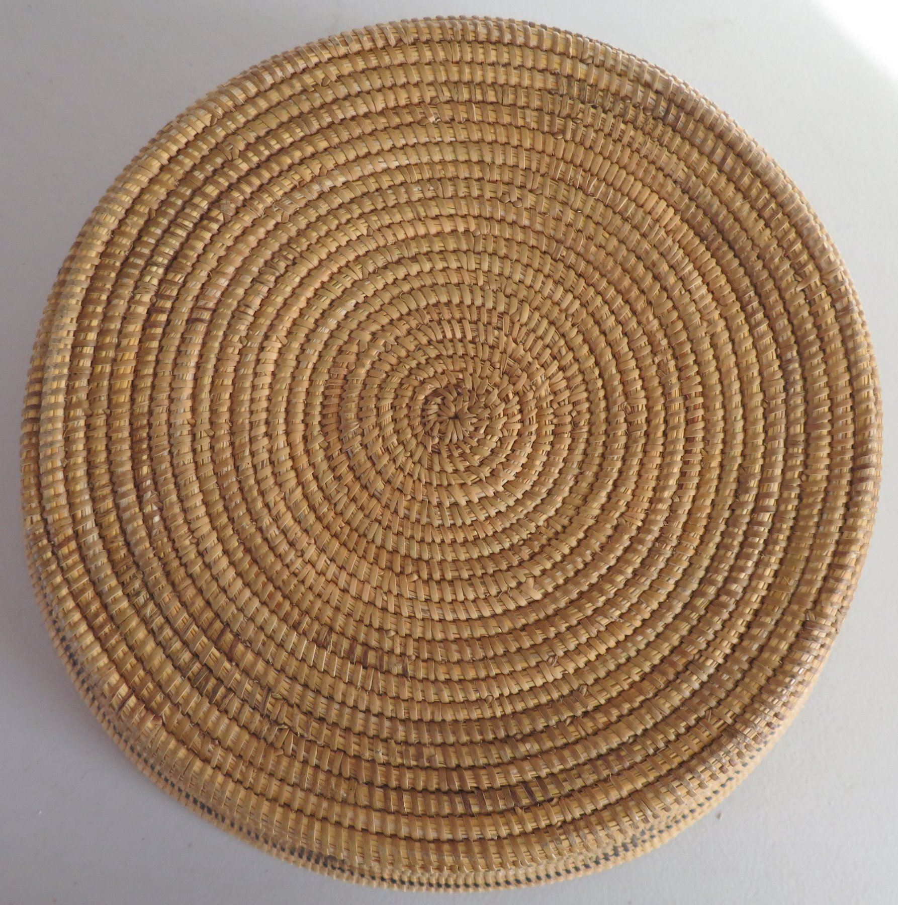 Mission Basket, c. 1940s. Made of juncus, the item measures 15 1/2" x 6 1/2". San Diego County, California. Condition: Good, see images. Shipping: $50.00 w/insurance and signature, due to size and value.