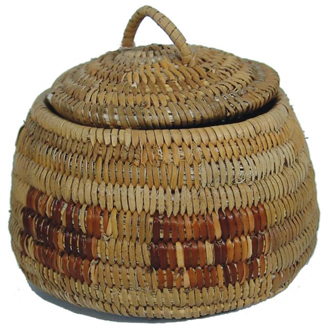 Early 1900s, Unique design rounded bowl with interesting polychrome accents and handled lid; very good condition. 3-1/4" x 4"