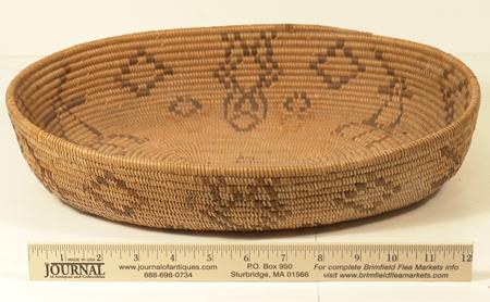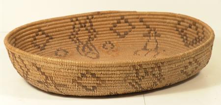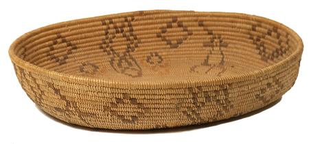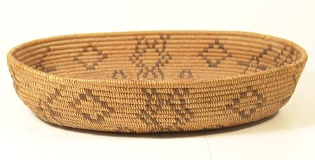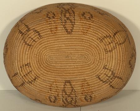 Beautiful low profile oval basketry vessel with interesting polychrome figures (humans, babies(?)) and diamonds. Purchased from Turney's in 1982 for $500; appraisal value $1,200. Condition: good. 3" x 14" x 12"