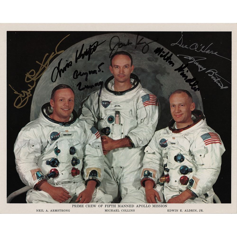 Official color 10 x 8 NASA lithograph of the Apollo 11 crew in their white space suits, signed by in ink and felt tip by seven notable personnel members of Mission Control Center: Gene Kranz, Chris Kraft, Glynn S. Lunney, Jack King, Milton Windler, Dee O'Hara, and Jerry Bostick. In fine condition.