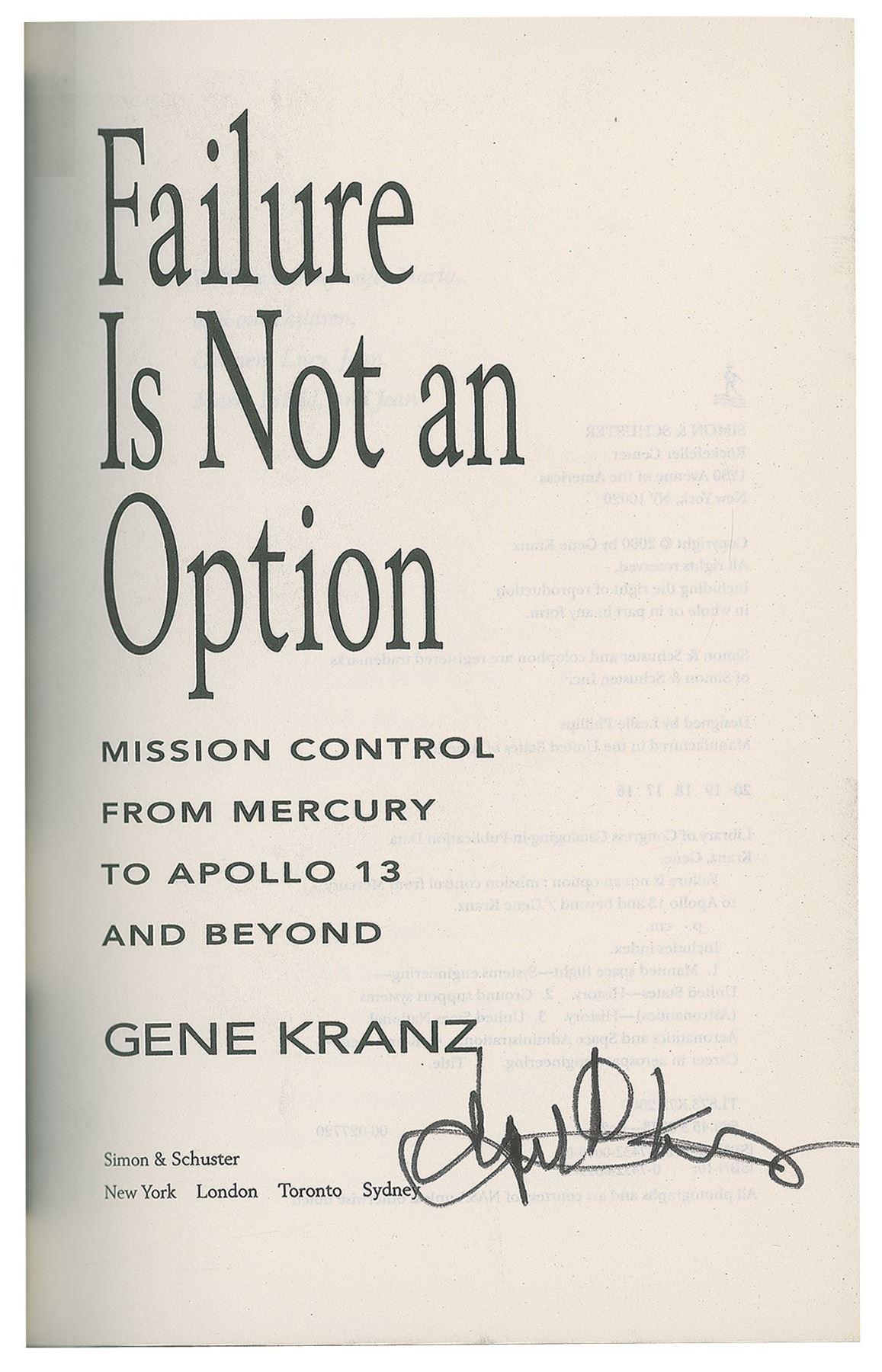 Three books signed by NASA's esteemed flight directors, all hardcovers with dust jackets, including: Gene Kranz (Failure Is Not An Option, signed on the title page) and Chris Kraft (two copies of Flight: My Life in Mission Control, one signed on the half-title page and the other signed on a card affixed to the first free end page). In overall fine condition.