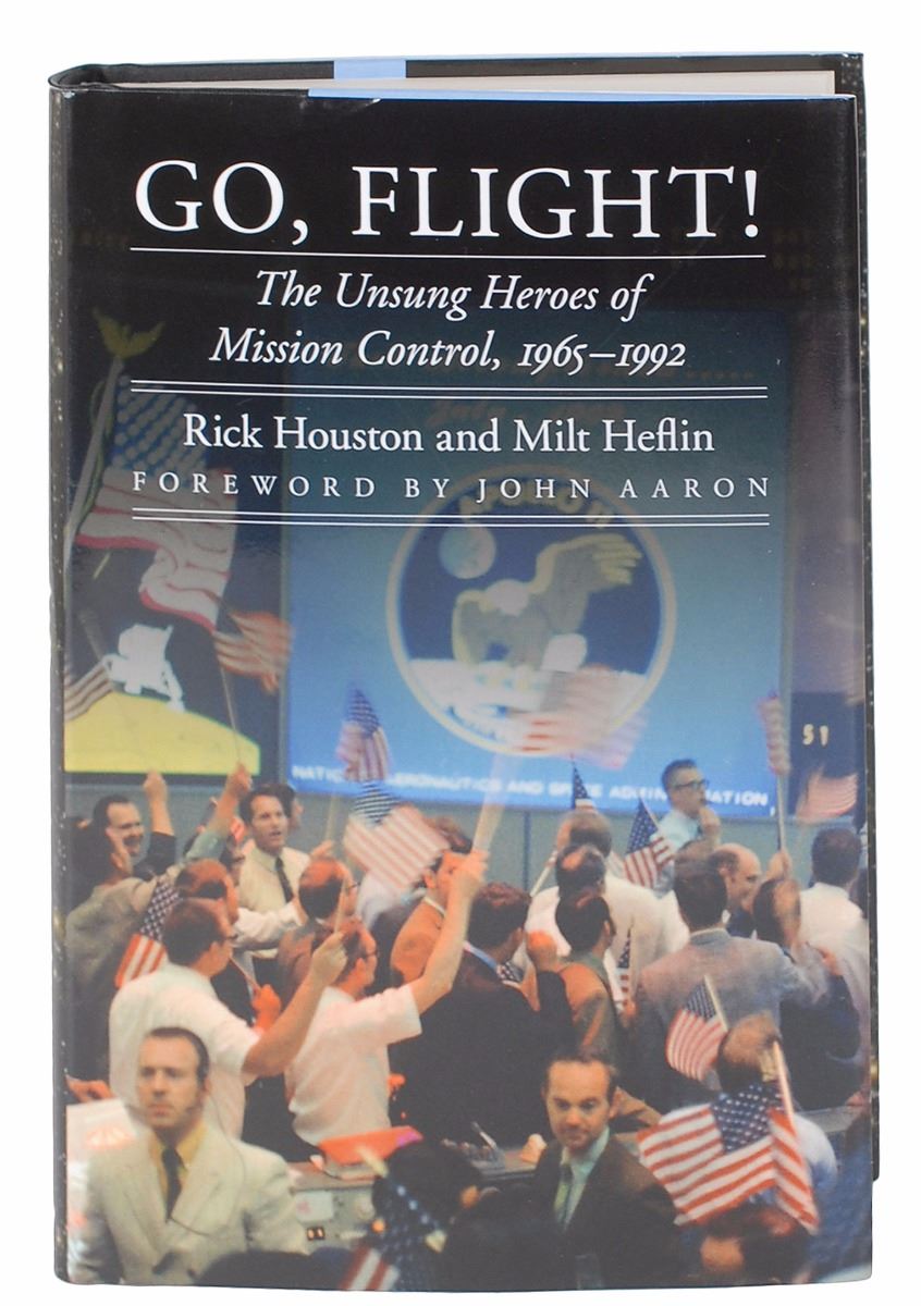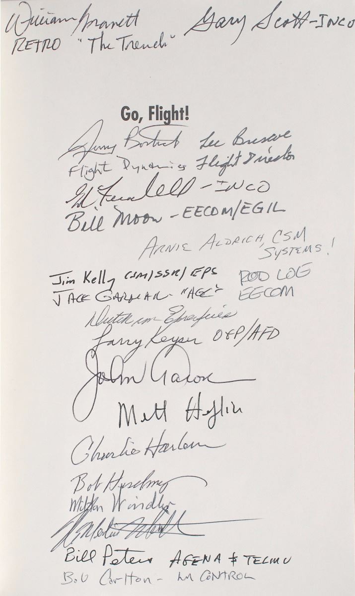 Signed book: Go, Flight!. First edition. Lincoln, NE: University of Nebraska, 2015. Hardcover with dust jacket, 6.25 x 9.25, 341 pages. Signed on the half-title page in black ink and ballpoint by 20 members of NASA’s mission control, including: Jerry Bostick, Gary Scott, Lee Briscoe, Bill Moon, Arnie Aldrich, and Milton Windler. In fine condition.