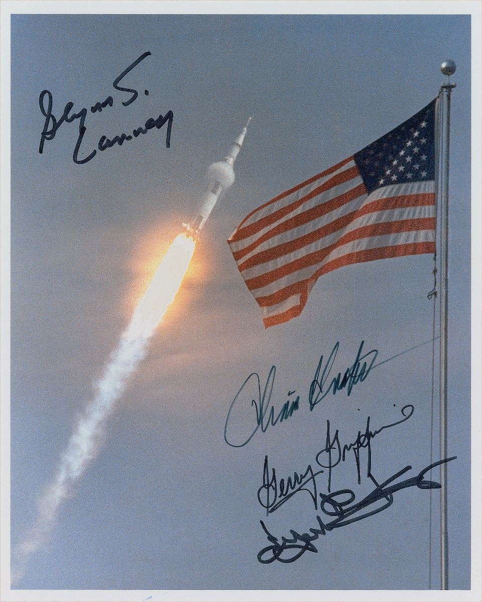 Color satin-finish 8 x 10 photo of a launch with an American flag in the foreground, signed in black felt tip by Glynn S. Lunney, Chris Kraft, Gene Kranz, and Gerry Griffin. In fine condition, with a slightly grainy quality to the image.