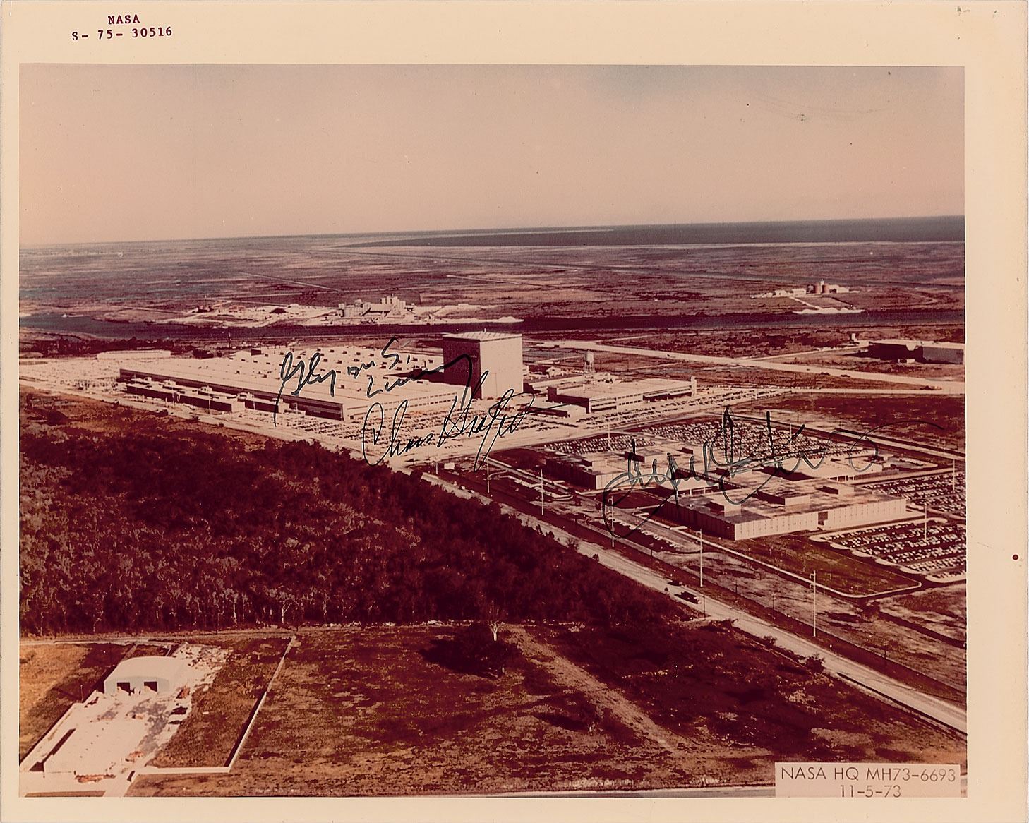 Official color satin-finish 10 x 8 red-numbered NASA photo of Johnson Space Center in Houston, signed in black felt tip by Glynn S. Lunney, Chris Kraft, and Gene Kranz. Reverse bears “This paper manufactured by Kodak” watermarks. In fine condition.