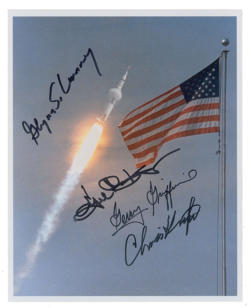 Color satin-finish 8 x 10 photo of a rocket launch with an American flag pictured in the foreground, signed in black felt tip by Glynn S. Lunney, Chris Kraft, Gene Kranz, and Gerry Griffin. In fine condition, with a trivial brush to Kranz's signature.