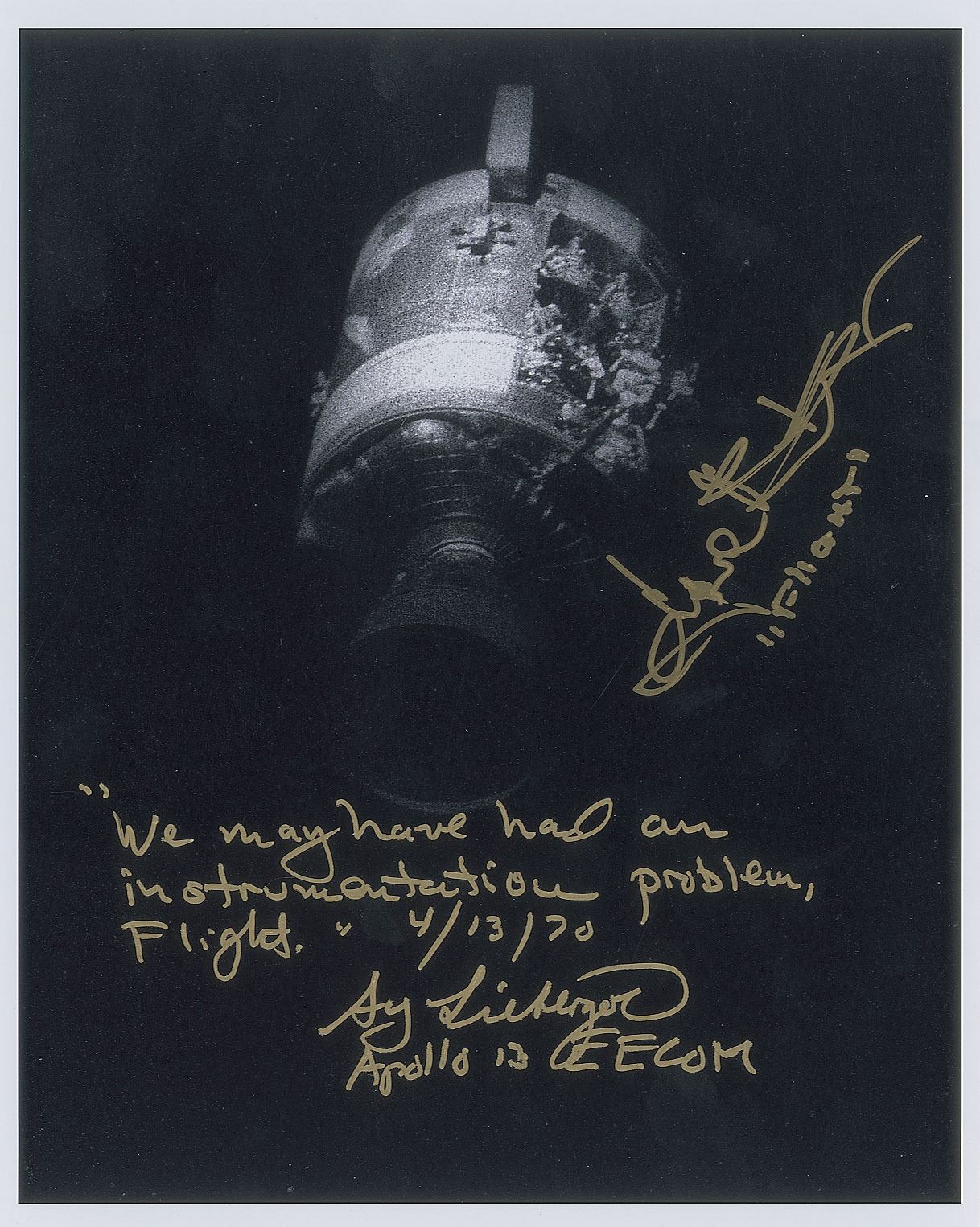 Satin-finish 8 x 10 photo of the damaged Apollo 13 Service Module, signed in gold ink, "Gene Kranz, 'Flight,'" and "'We may have had an instrumentation problem, Flight,' 4/13/70, Sy Liebergot, Apollo 13 EECOM." In very fine condition.