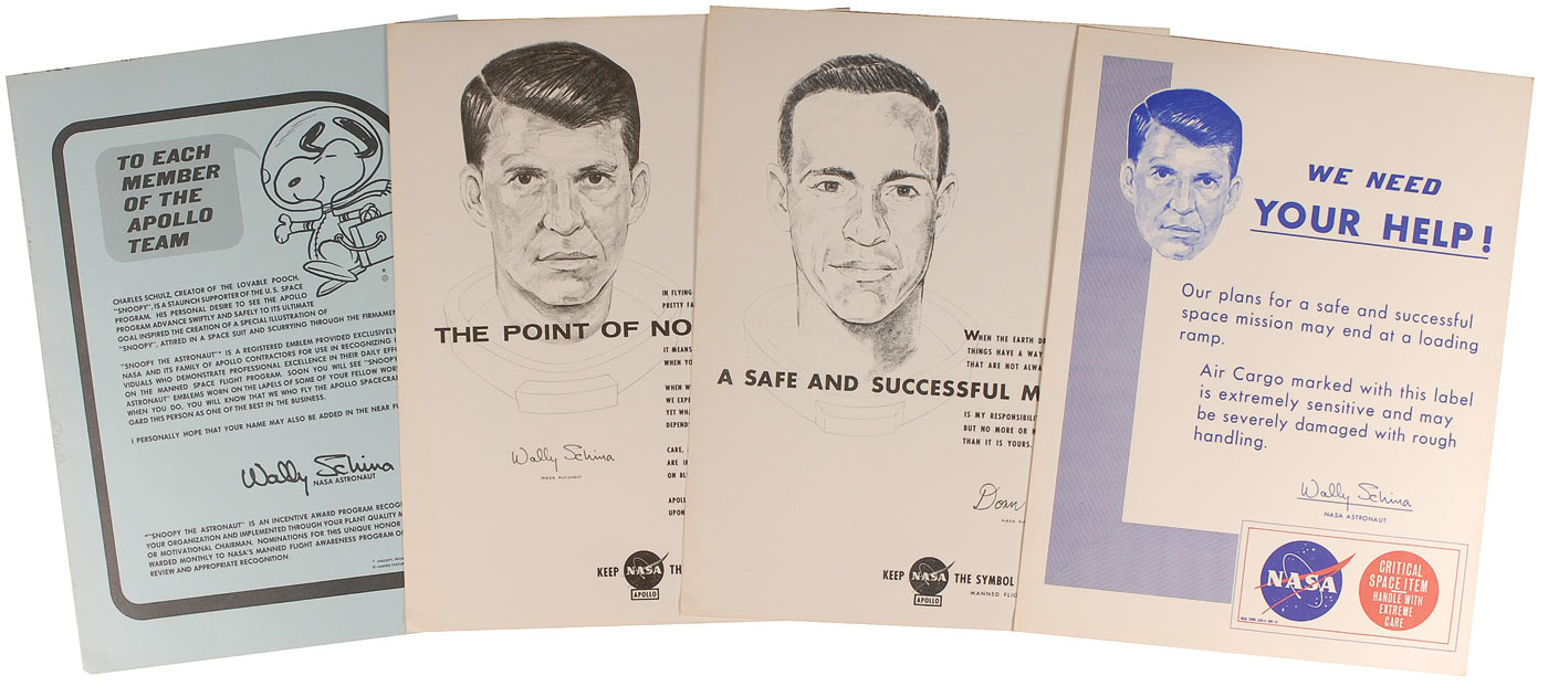 Four different NASA Manned Flight Awareness (MFA) posters, each measuring 8 x 10.5. Two of the posters feature an image of Wally Schirra, with one identifying the importance of handling critical space cargo; one featuring Donn Eisele, and one promoting the ‘Snoopy the Astronaut’ incentive program. These posters were issued by NASA to engender enthusiasm and diligence in the people working in the space program. In fine condition.