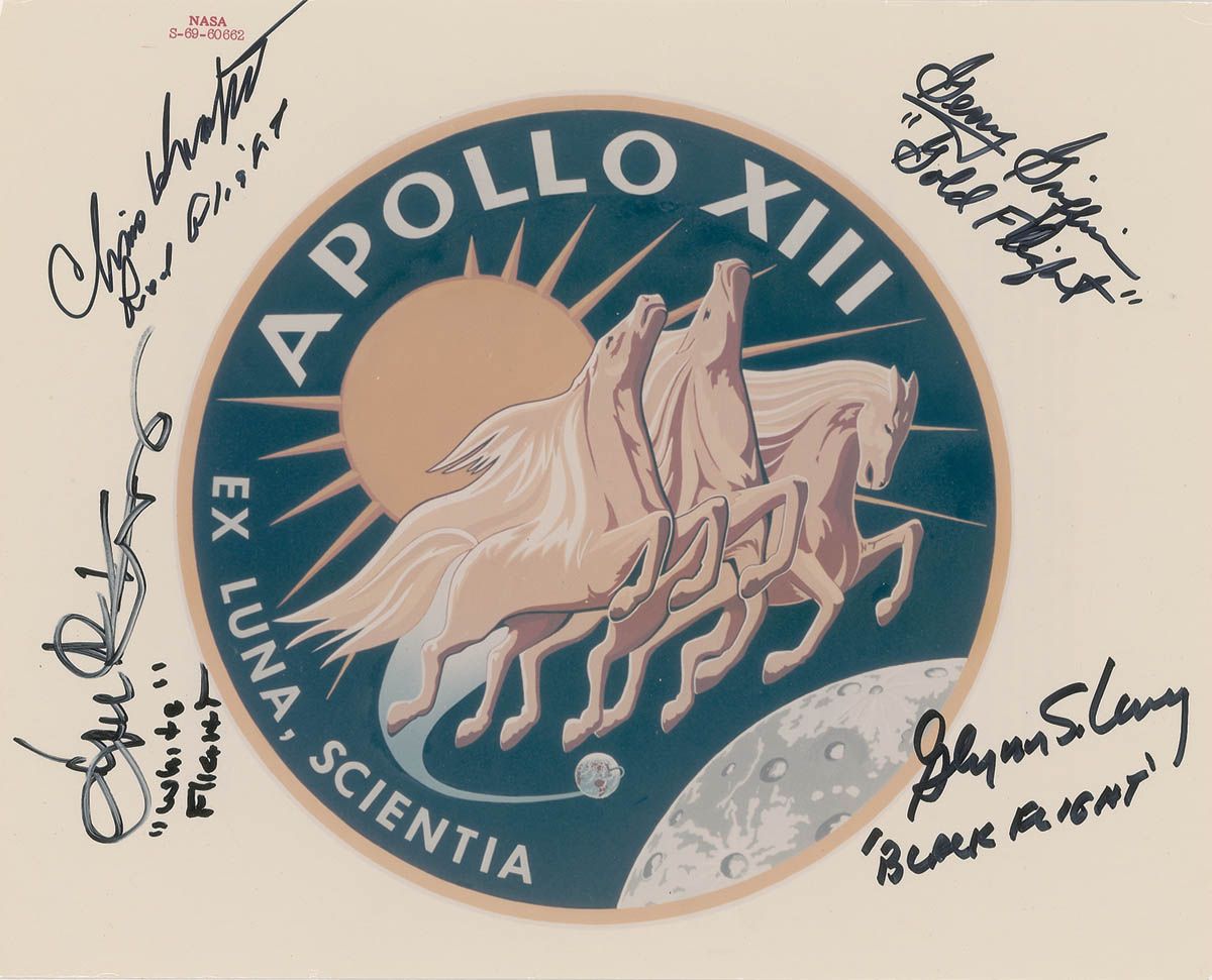 Color glossy 10 x 8 ‘red-numbered’ NASA photo of the Apollo 13 emblem, signed in black felt tip by Chris Kraft, Gene Kranz, Glynn Lunney, and Gerry Griffin, with each adding his associated flight designation below. In fine condition, with a surface crease to the upper right corner tip and a ding to the top edge.