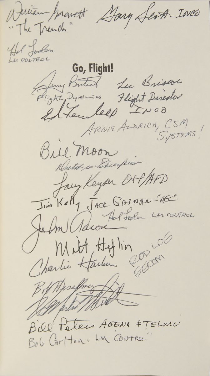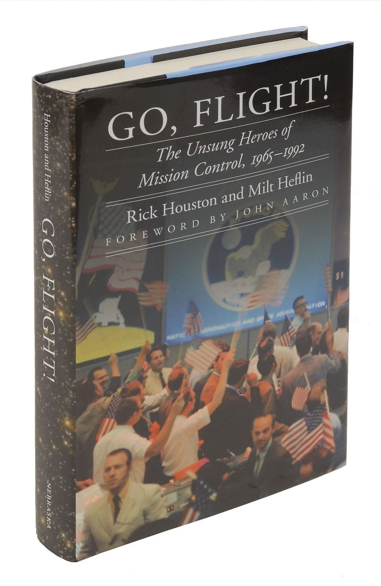 Signed book: Go, Flight!. First edition. Lincoln, NE: University of Nebraska, 2015. Hardcover with dust jacket, 6.25 x 9.25, 341 pages. Signed on the half-title page in black ink and ballpoint by 20 members of NASA’s mission control, including: Lee Briscoe, Bill Moon, Arnie Aldrich, Bill Peters, Jim Kelly, Gary Scott, Milt Heflin, and Hal Loden (2). In fine condition.