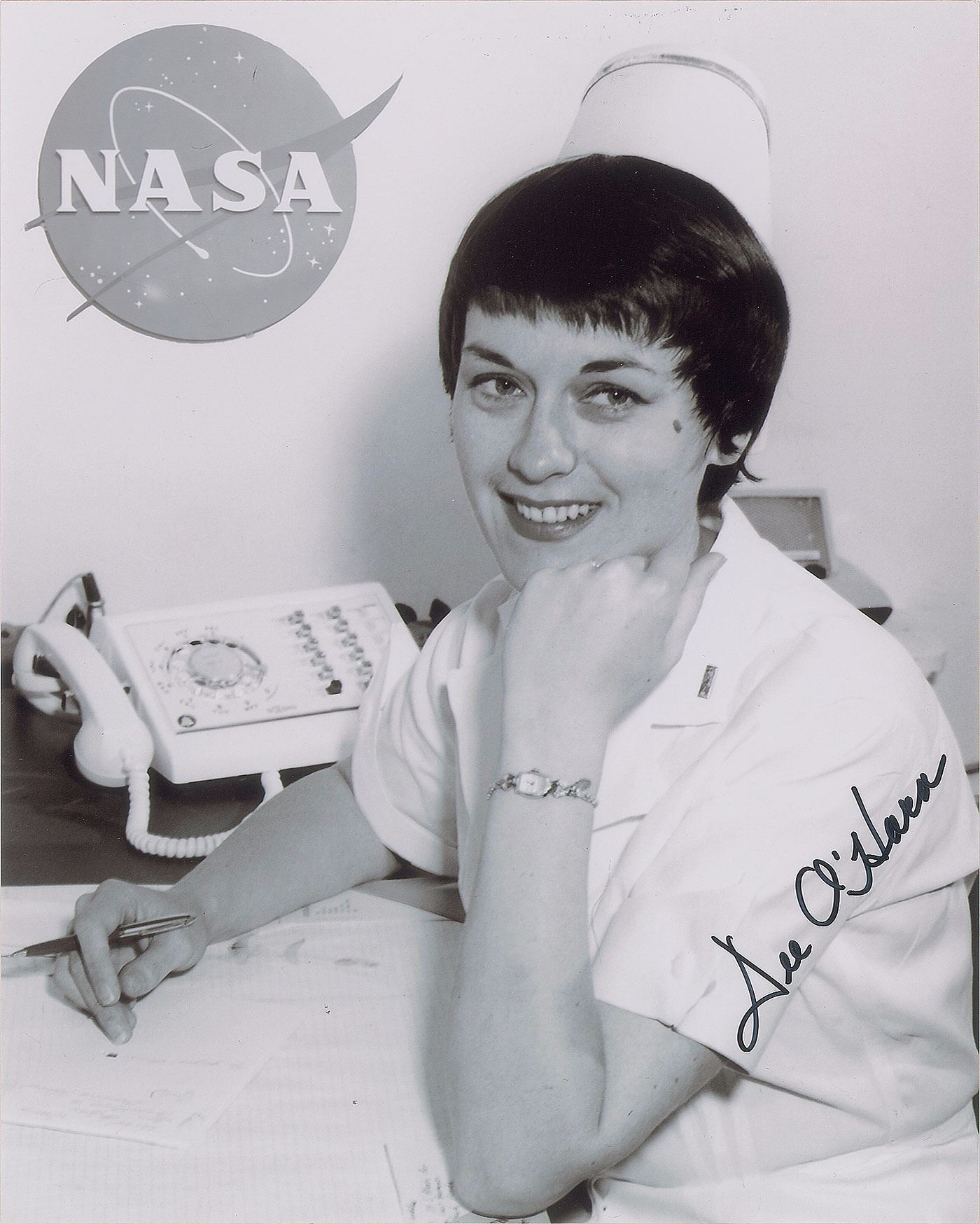 Three semi-glossy photos: an 8 x 10 portrait of NASA nurse Dee O'Hara, signed in black felt tip; an 8 x 10 portrait of pad leader Guenter Wendt, signed in black felt tip; and a color 10 x 8 photo of flight director Gerry Griffin, signed in black felt tip and adding "Apollo Flight Director." In overall fine to very fine condition.