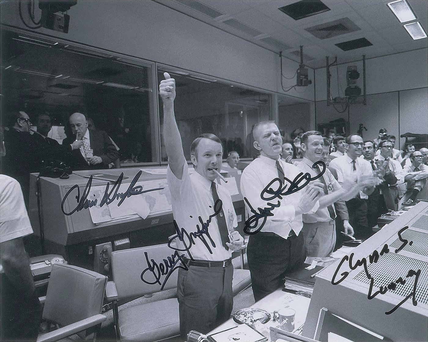 Satin-finish 10 x 8 photo of Mission Control celebrating the successful splashdown and recovery of Apollo 13, signed in black felt tip by Gene Kranz. Chris Kraft, Gerry Griffin, and Glynn S. Lunney. In fine condition, with a few edge dings.