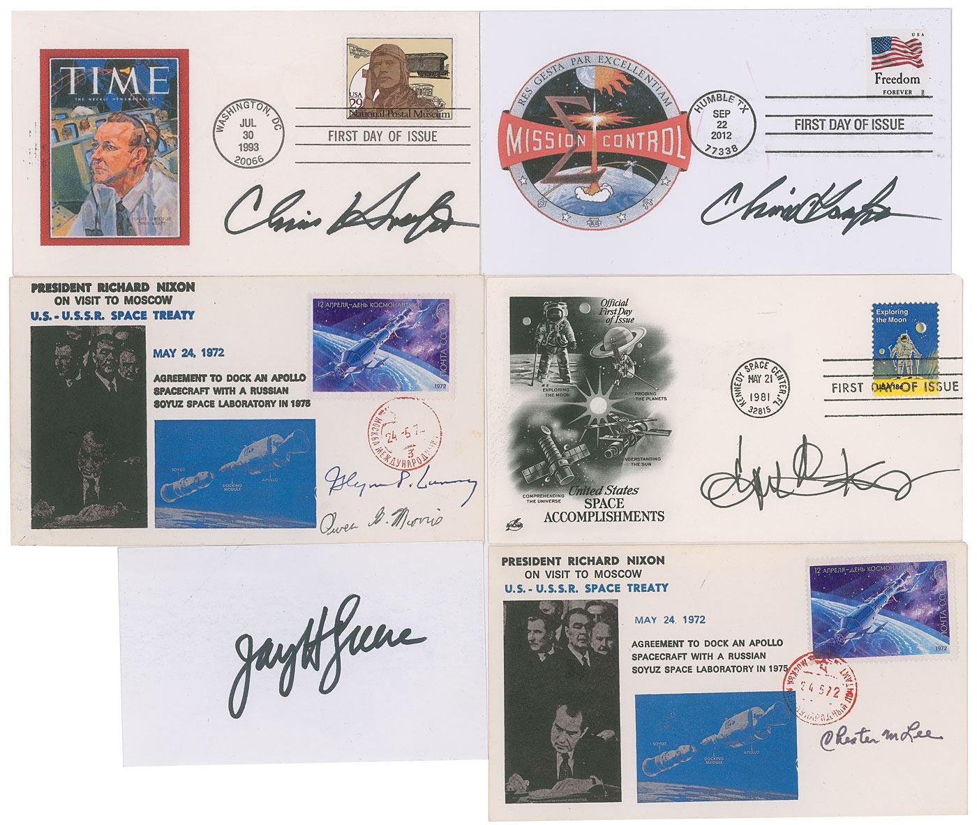 Six items signed by members of NASA's Mission Control, including: Chris Kraft (two FDCs), Gene Kranz (FDC), Chester M. Lee (commemorative cover), Glynn S. Lunney and Owen G. Morris (commemorative cover), and Jay Greene (signature). In overall very fine condition.