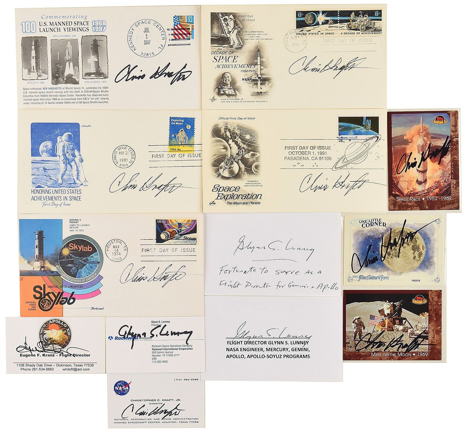 Group of 13 items signed by members of NASA's Mission Control, including: Gene Kranz (business card); Chris Kraft (five covers, three Topps trading cards, and a business card); and Glynn S. Lunney (two signatures and a business card). In overall fine condition.