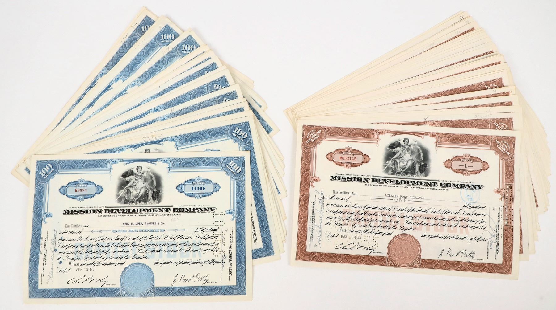 About 60 issued stock certificates from the Mission Development Company, signed J. Paul Getty, President. Blue ink and warrior princess vignette on hundred share certificates (about half); and brown ink, same vignette on certificates for less than a hundred shares. Mission Development Company was a holding company formed by J. Paul Getty to hold stock in Tidewater Oil Company. Getty controlled Mission Development and Getty Oil, which together gave him majority control over Tidewater. The two companies, Mission Development and Tidewater, were later merged into Getty Oil in 1967, at which point Mission Development ceased to exist as a separate entity.
