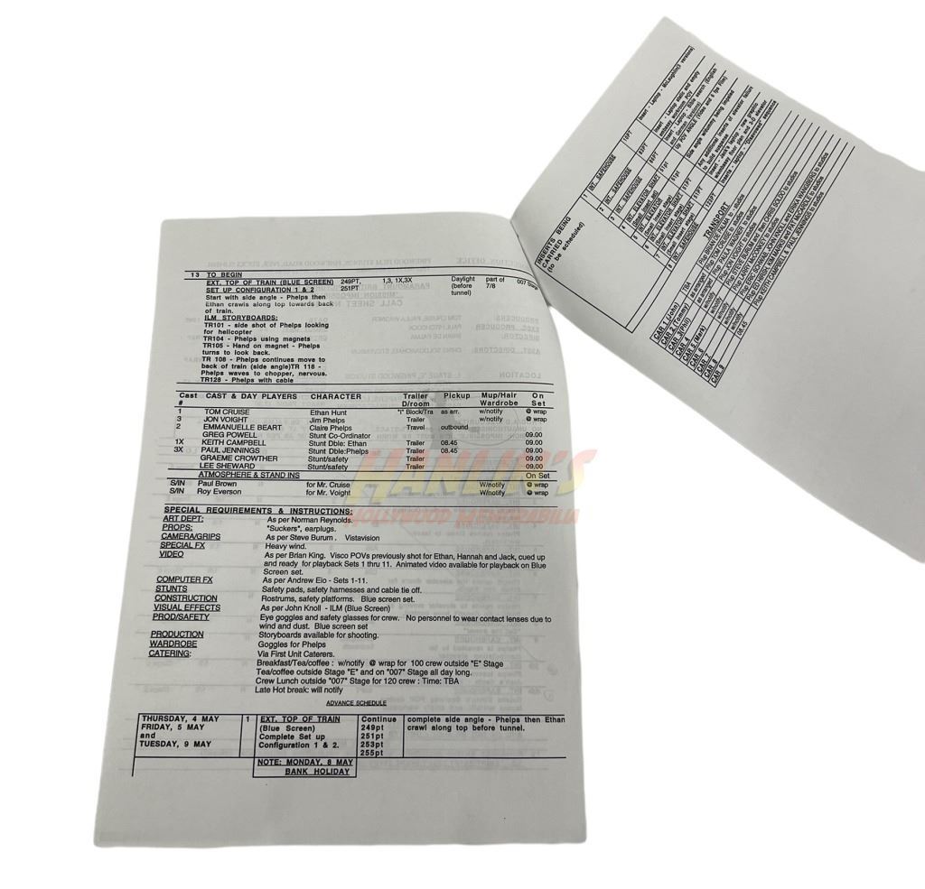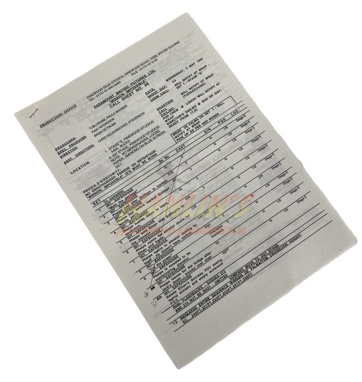 Original production used callsheet used in the production of the Brian De Palma spy film 'Mission: Impossible' (1996), produced by and starring Tom Cruise, where Ethan Hunt (Cruise) seeks to uncover who framed him for the murders of most of his Impossible Missions Force (IMF) team.