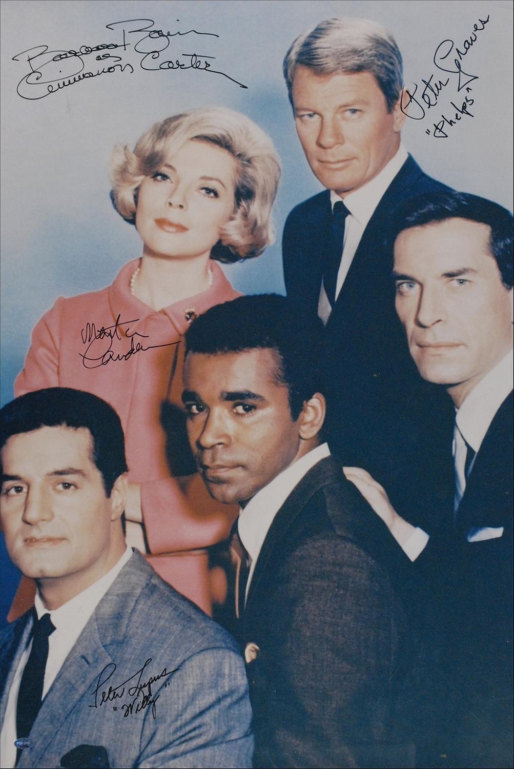 Color satin-finish 24 x 36 cast photo, signed in black felt tip by Martin Landau, Barbara Bain, Peter Graves, and Peter Lupus, with all but Landau also adding their character names. Rolled and in fine condition.