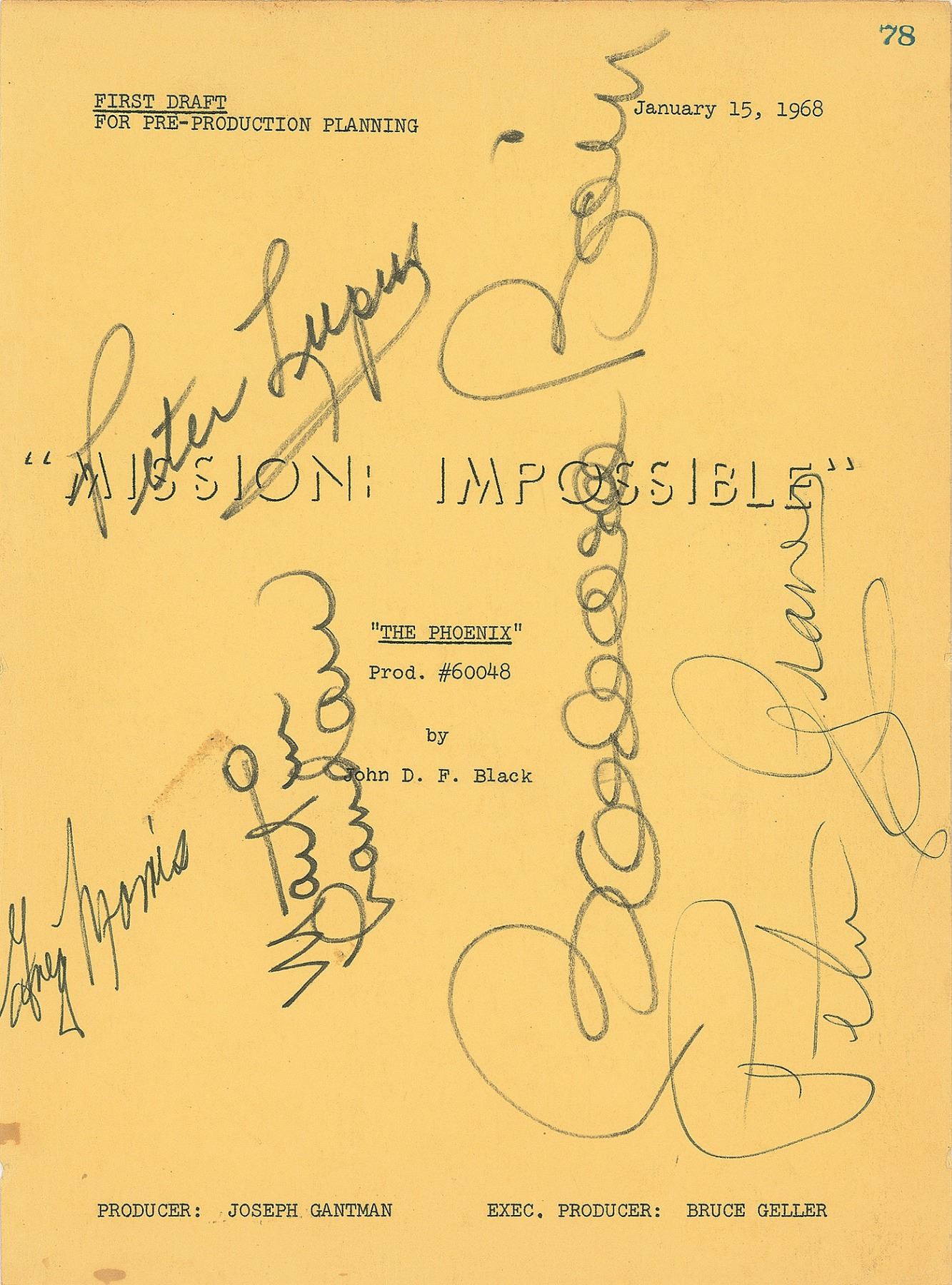 Cover from a pre-production first draft script for the Mission: Impossible episode 'The Phoenix,' January 15, 1968, 8 x 10.75, signed in black felt tip by Peter Lupus, Greg Morris, Peter Graves, Martin Landau, and Barbara Bain. In fine condition, with a few small stains and a trimmed left edge.