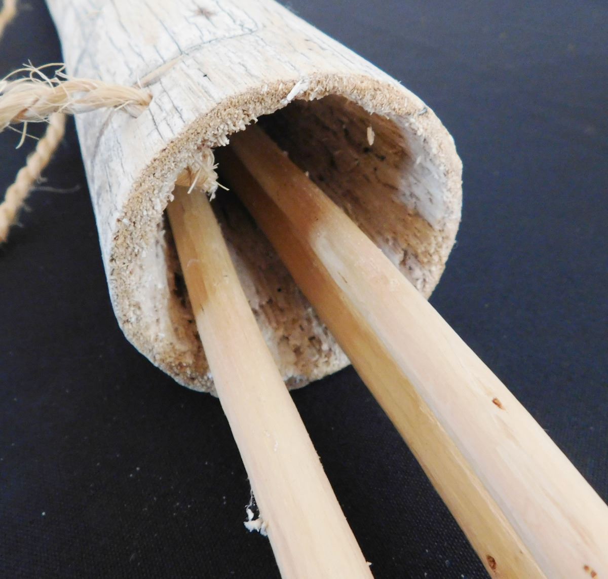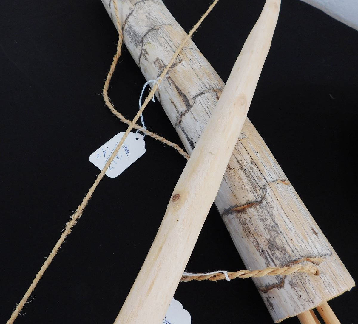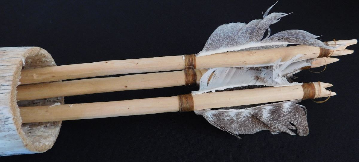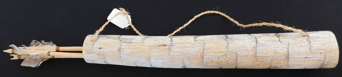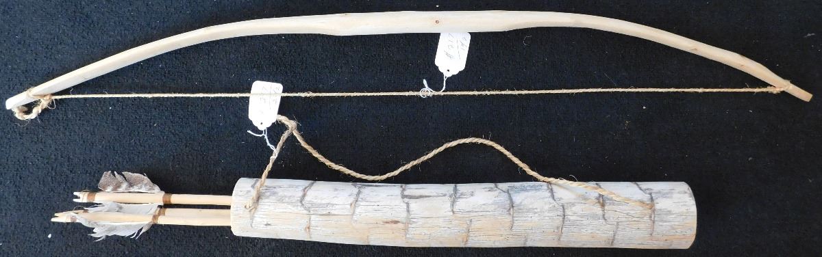 Mission Indian Bow, 3 Arrows & Quiver, 20th century, made of yucca stalk, ash and feathers. Bow measures 46" x 1.5", arrows measure 31" x 0.5" and the quiver measures 23" x 3". Mission Indians, San Diego County, California. Condition: Good, see images. Shipping: $36.