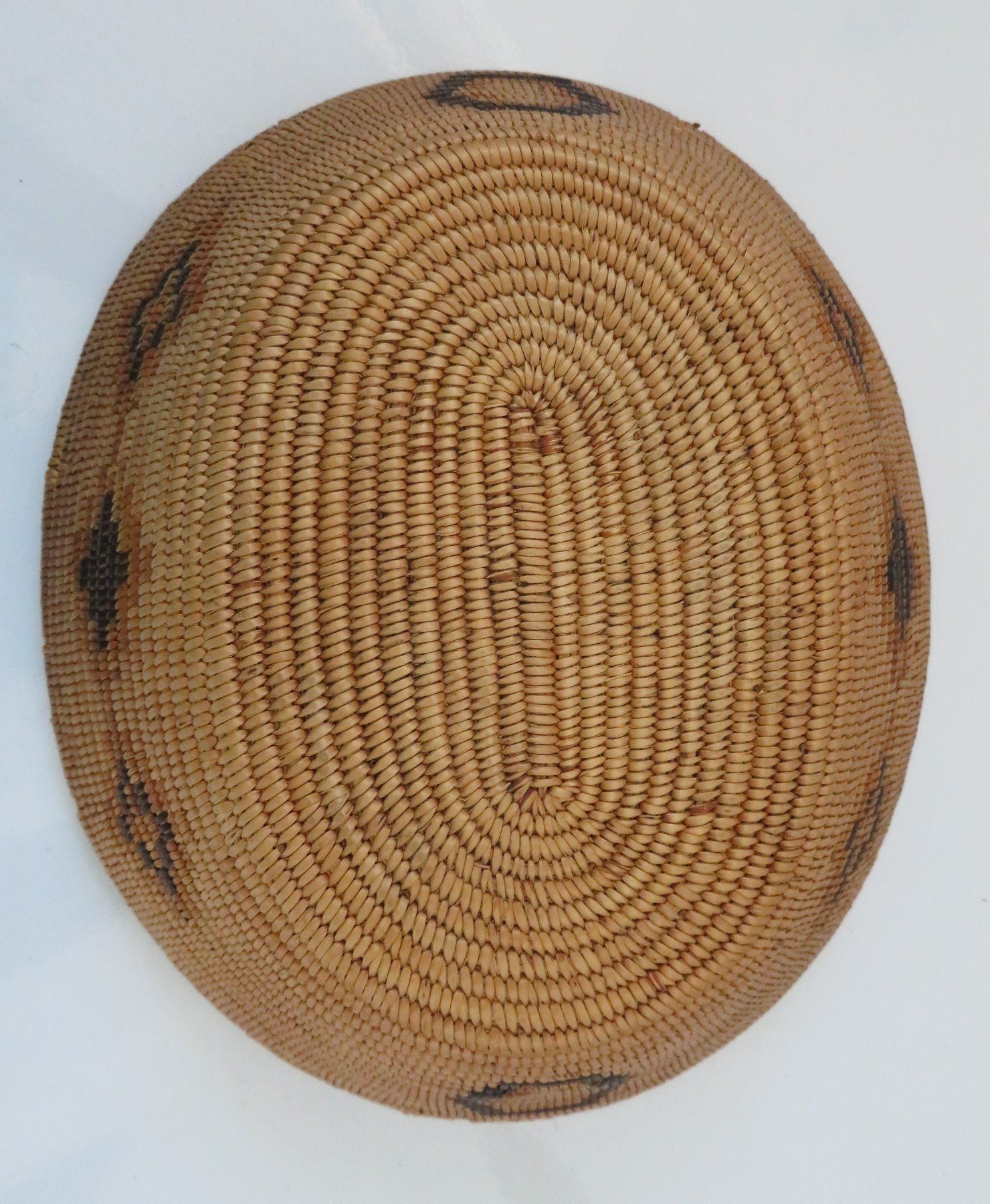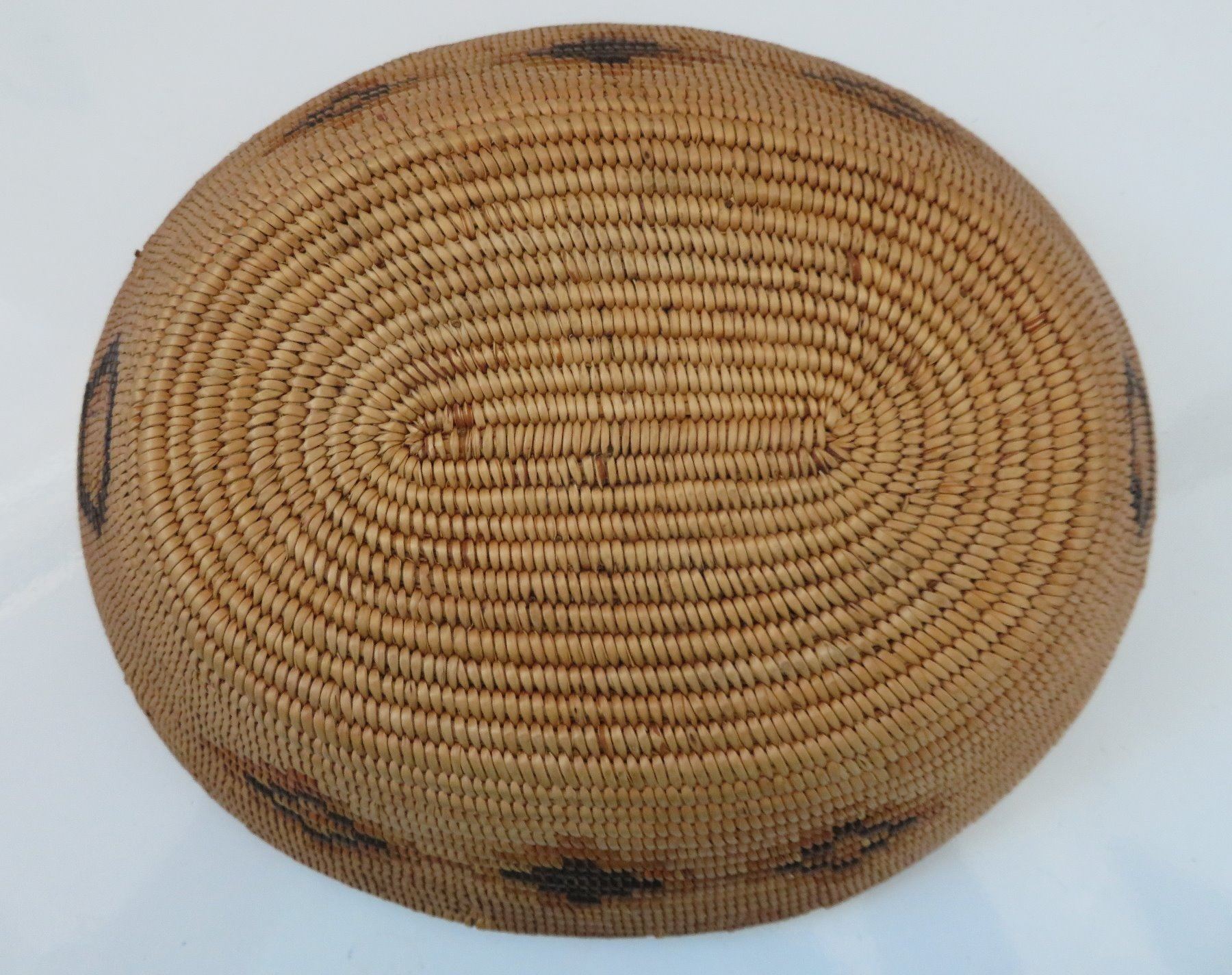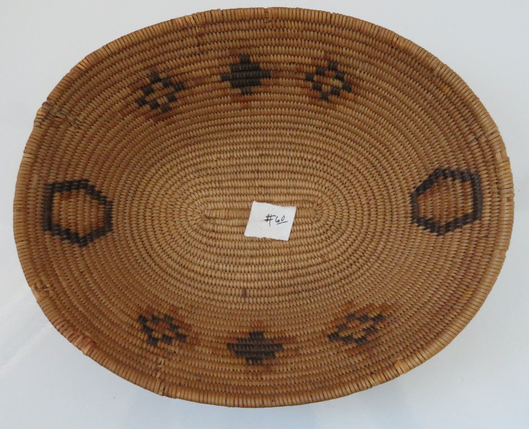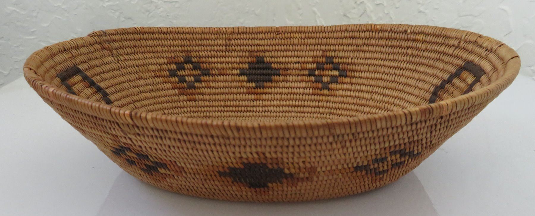 Mission Indian Polychrome Oval Basket, c. 1910. Made of willow, juncus and dyed juncus, the item measures 9" x 7 1/2". Alpine, San Diego County, Calif. Average of 13 stitches per inch. Condition: Excellent w/patina and minimal stich loss, see images. Shipping: $35.00 USA estimate only, w/insurance and signature.