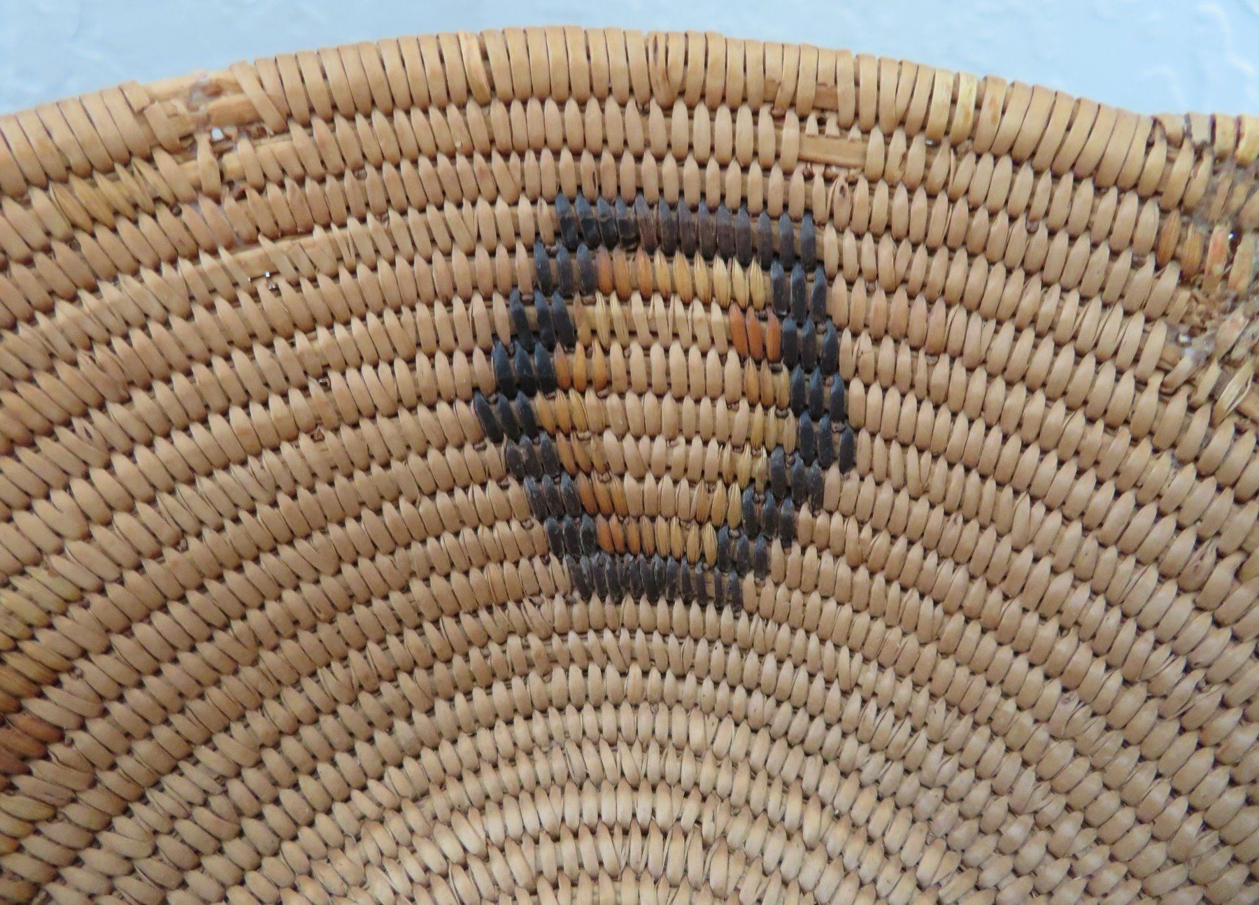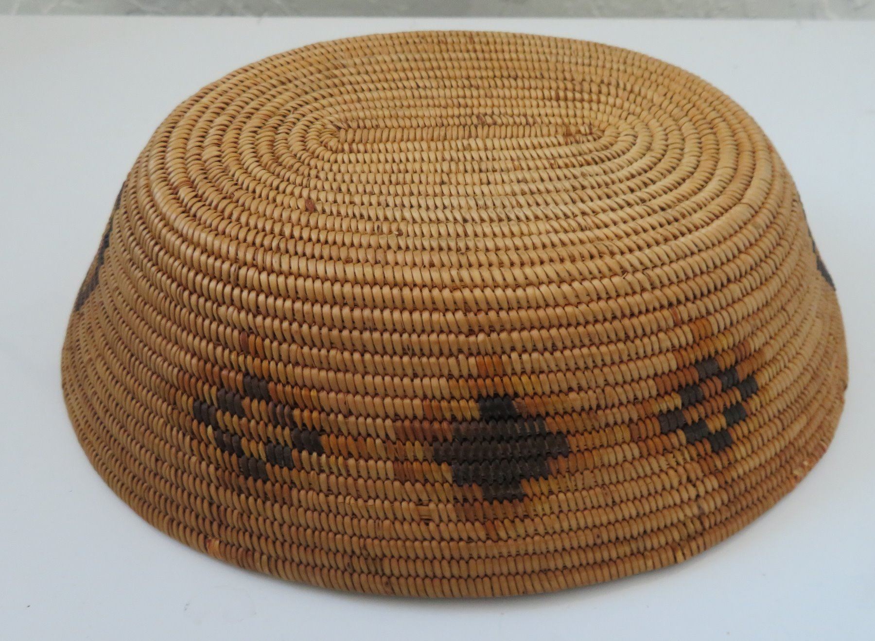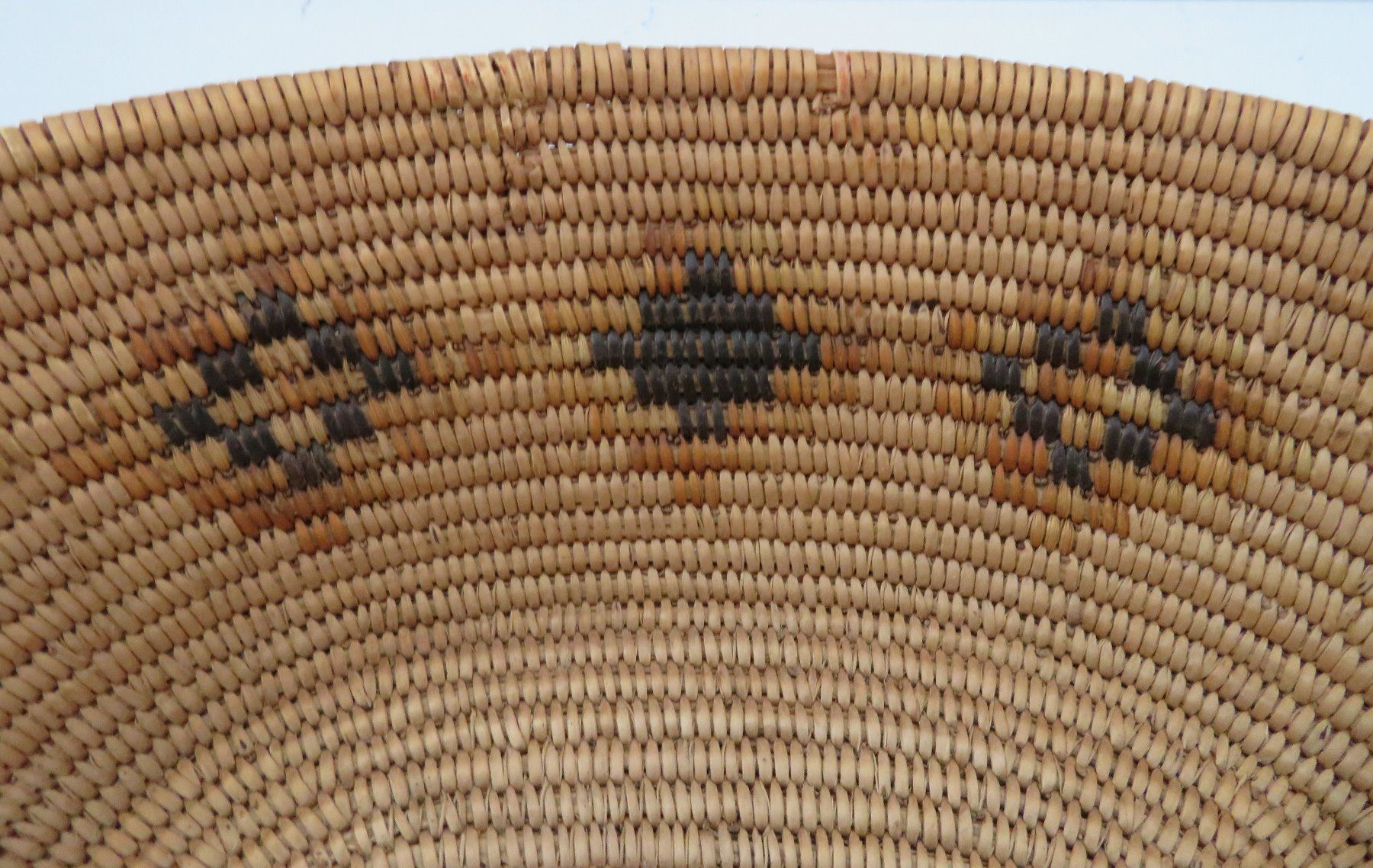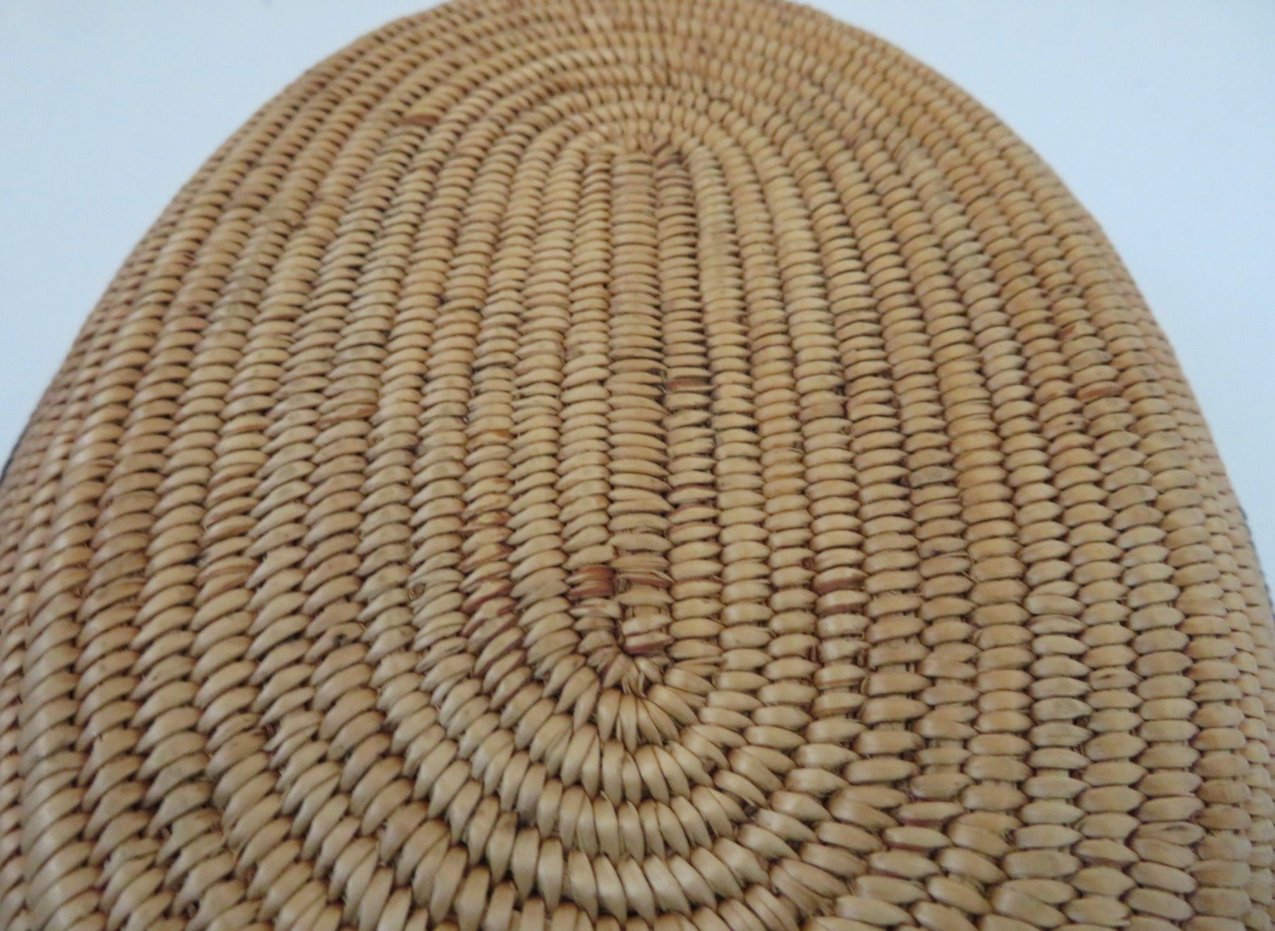 Mission Indian Polychrome Oval Basket, c. 1910. Made of willow, juncus and dyed juncus, the item measures 9" x 7 1/2". Alpine, San Diego County, Calif. Average of 13 stitches per inch. Condition: Excellent w/patina and minimal stich loss, see images. Shipping: $35.00 USA estimate only, w/insurance and signature.
