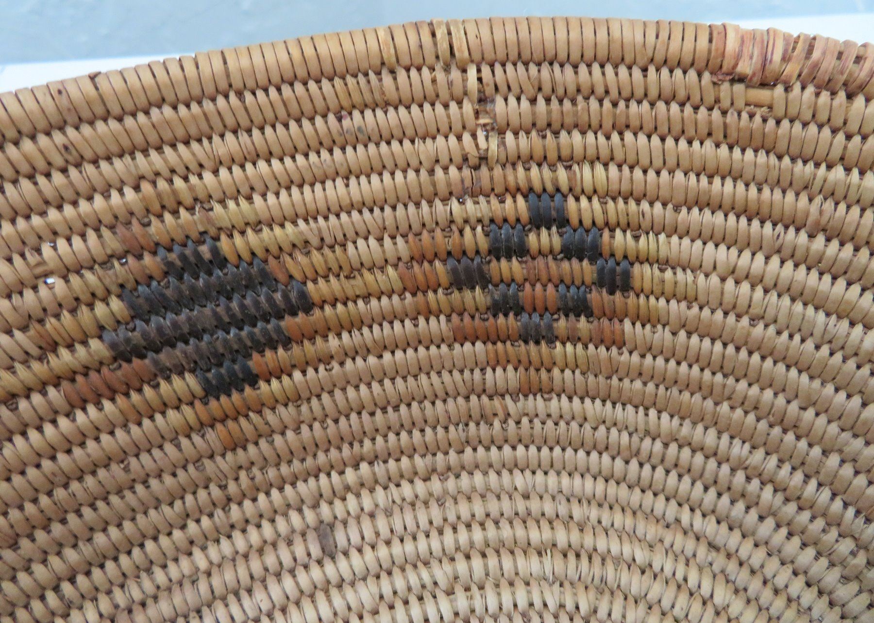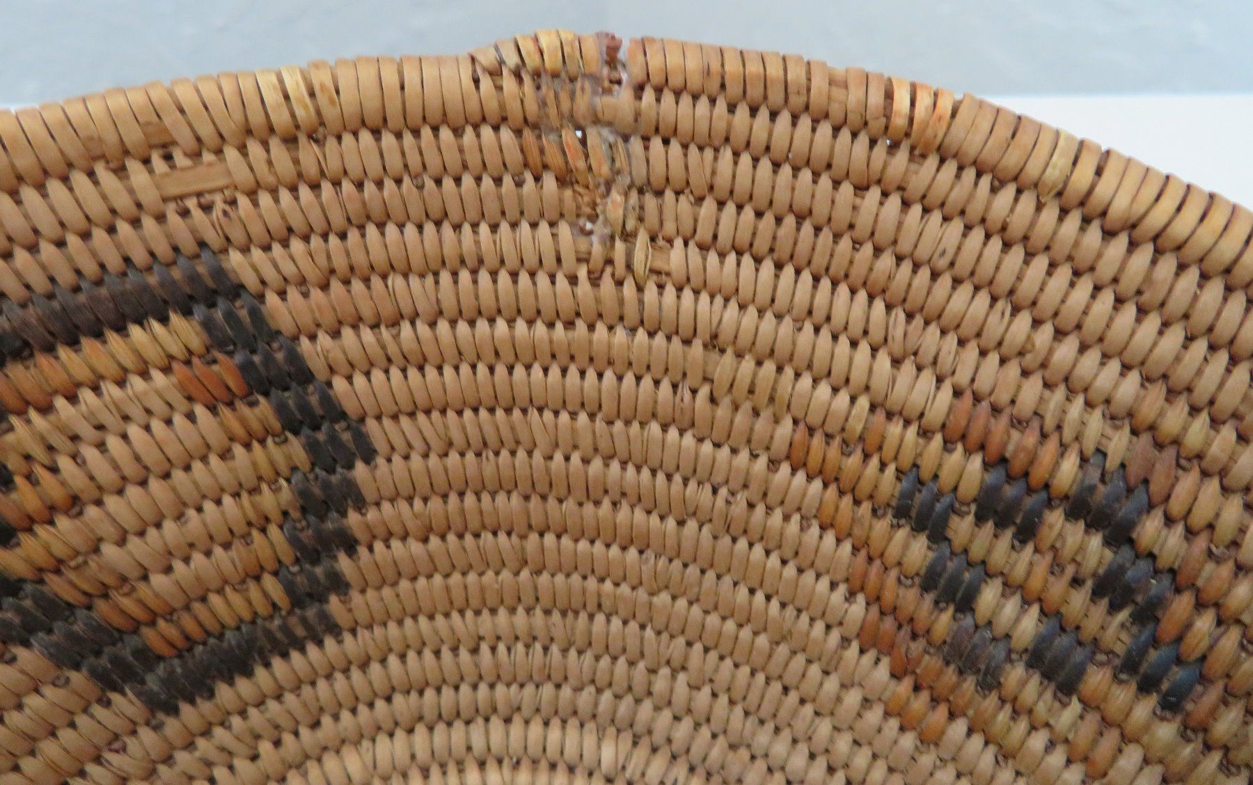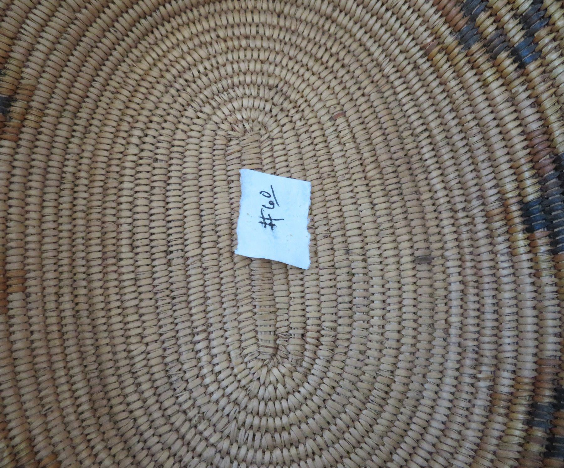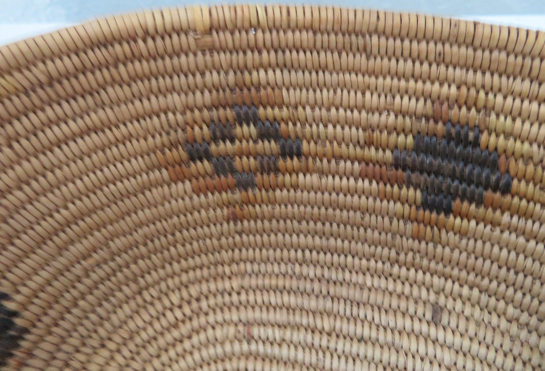 Mission Indian Polychrome Oval Basket, c. 1910. Made of willow, juncus and dyed juncus, the item measures 9" x 7 1/2". Alpine, San Diego County, Calif. Average of 13 stitches per inch. Condition: Excellent w/patina and minimal stich loss, see images. Shipping: $35.00 USA estimate only, w/insurance and signature.