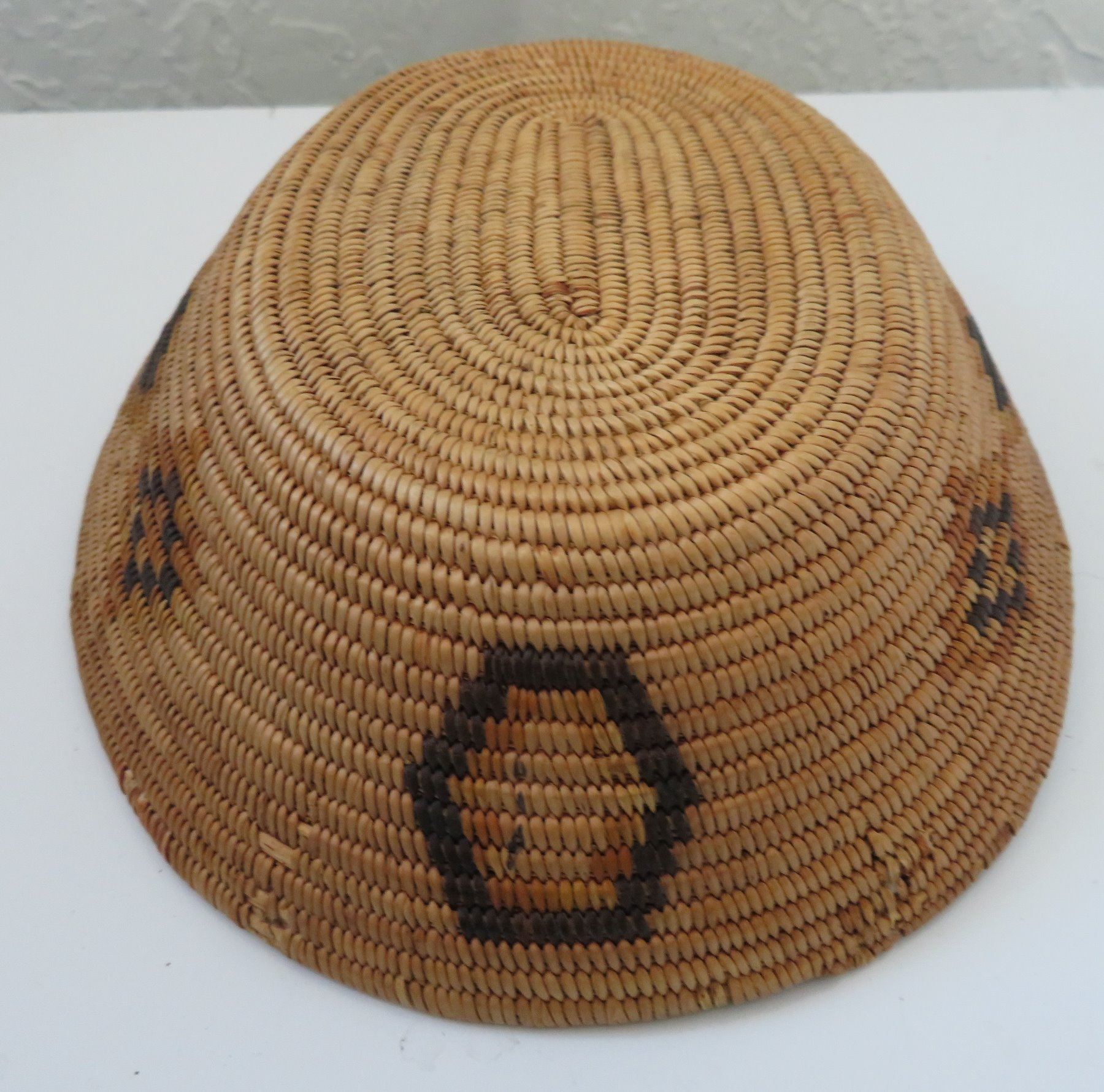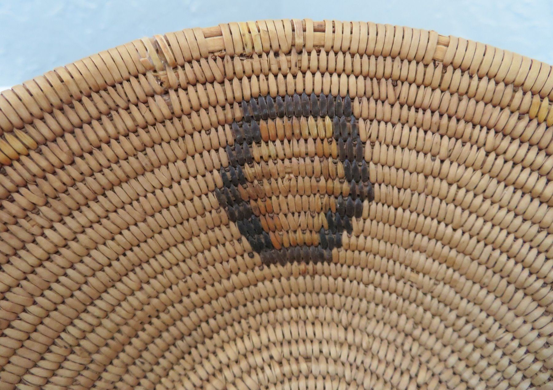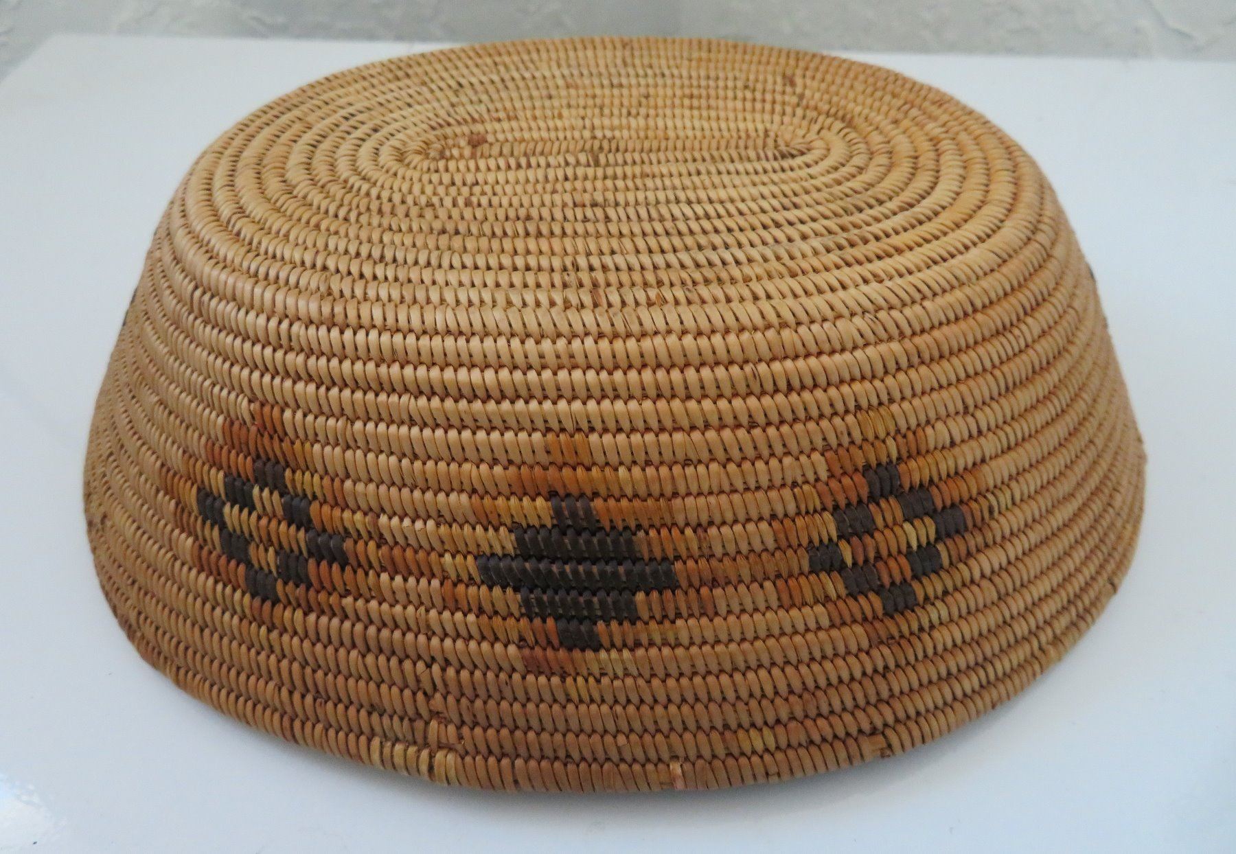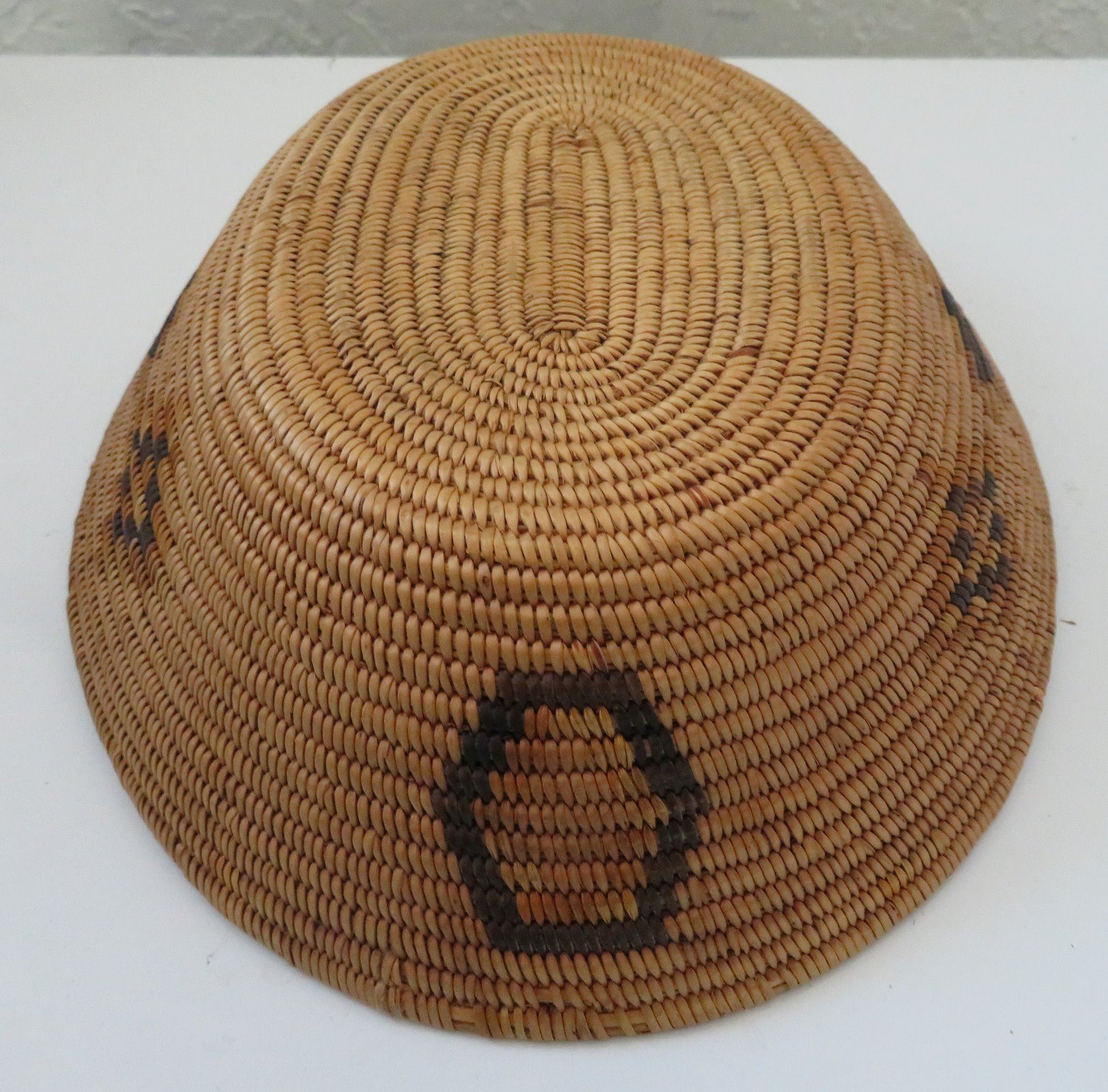 Mission Indian Polychrome Oval Basket, c. 1910. Made of willow, juncus and dyed juncus, the item measures 9" x 7 1/2". Alpine, San Diego County, Calif. Average of 13 stitches per inch. Condition: Excellent w/patina and minimal stich loss, see images. Shipping: $35.00 USA estimate only, w/insurance and signature.