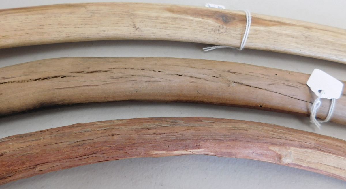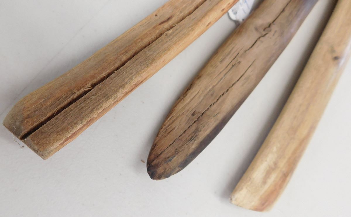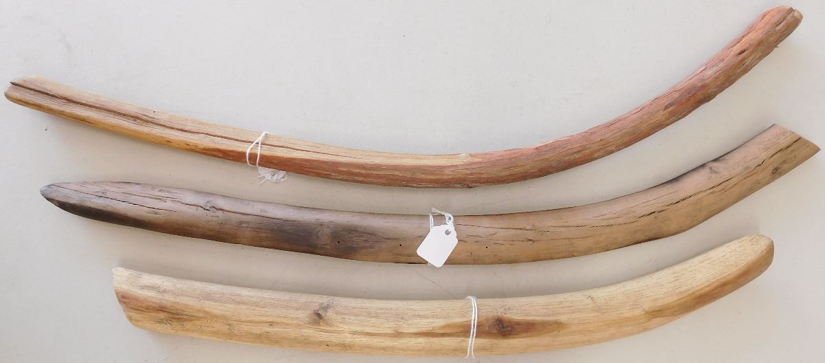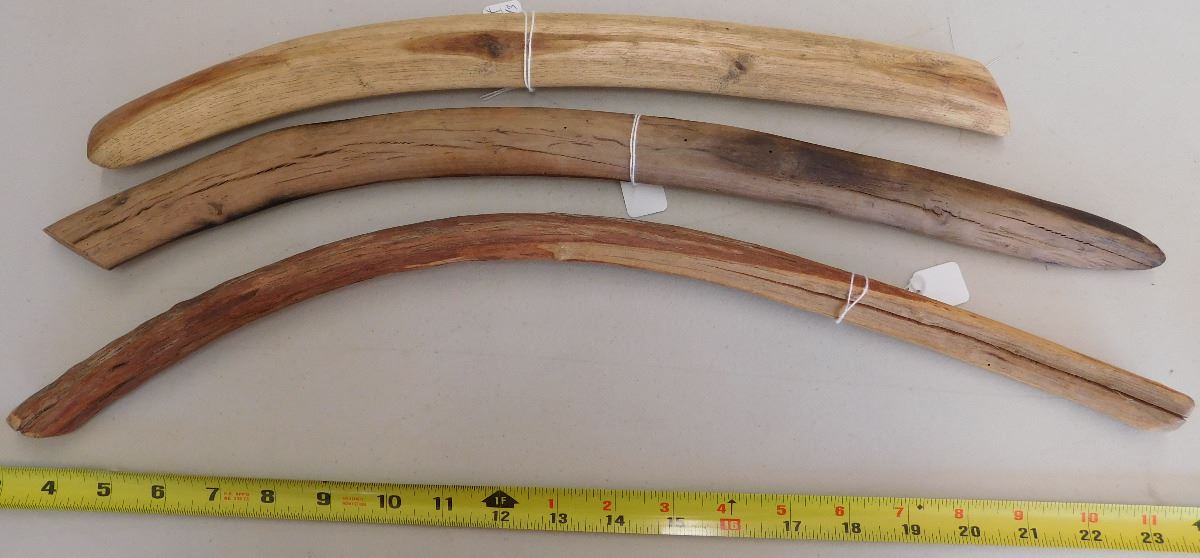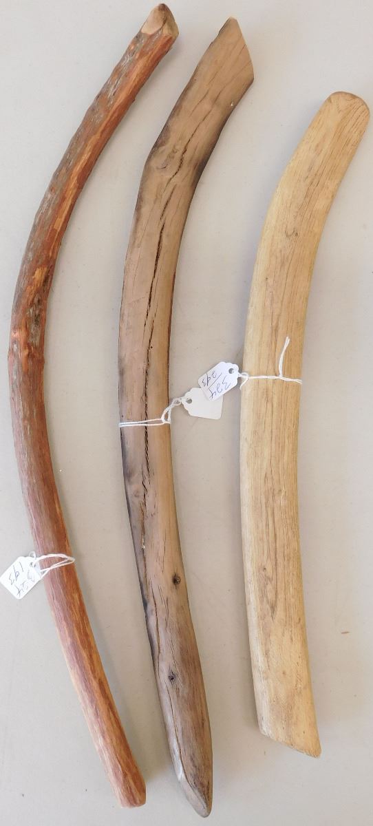 Mission Indian Rabbit Sticks, early 20th century items. Made of hardwood, these items measures 17.5" to 20" each. Found in Alpine, San Diego County, Calif. Used to strike rabbits when hunting. Condition: Some wear, see images. Shipping: $22.50, due to length.