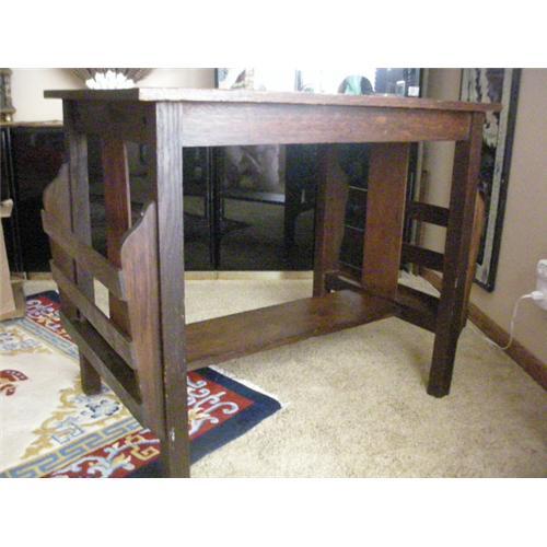 Antique mission oak desk or library table in very good/excellent condition with a few light scratches. An all original piece with duel newspaper racks on each side and a nice smaller size suitable for any room in the Arts & Craft home. GPX shipping is a low 68.00