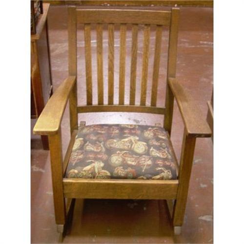 Up for sale is this Mission Oak Rocker with fun upholstered motorcycle print. The Fabric could be changed easily. The condition is very good all 7 slats are in order w/no cracking or repair to them. There are a few small cracks in the back of the rocker from age. Height is 33", Width is 26", Depth is 31" The front of the seat measures 18.5" the back of the seat measures 17.5" This would be a great addition to your home, recroom or office. If you have any other questions feel free to e-mail. Thanks for Looking!!!