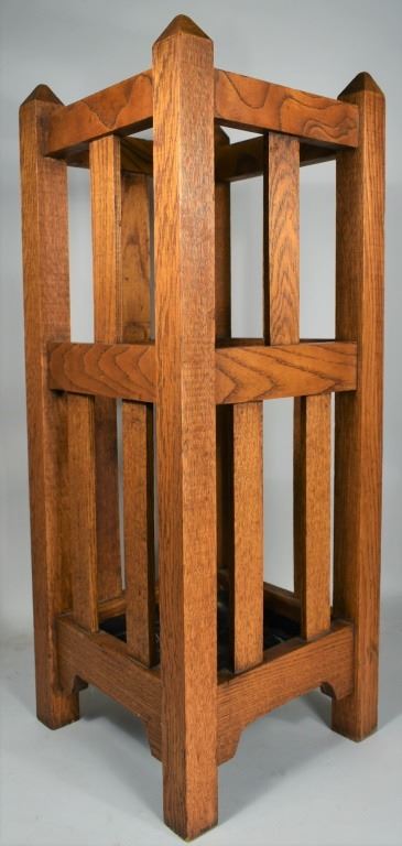 Mission Oak Umbrella - Cane Stand. Beautiful tiger stripe oak in mission decor. 10 3/4 square base X 27 1/2 inches tall.