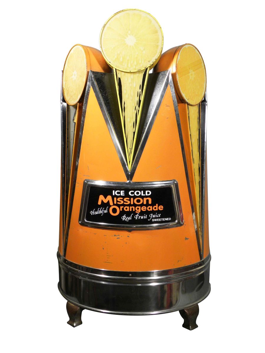 Mission Orange Soda Dispenser, Model "C" large size. A few scratches and dents, two broken glass panels otherwise good condition. 24 inch diameter X 42 inches tall.