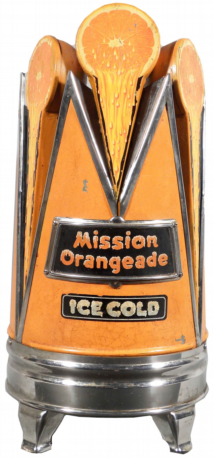 Mission Orangeade Ice Cold Dispenser. Some normal crazing and minor paint loss otherwise good condition. 7 1/2 inch diameter X 15 1/2 inches tall.