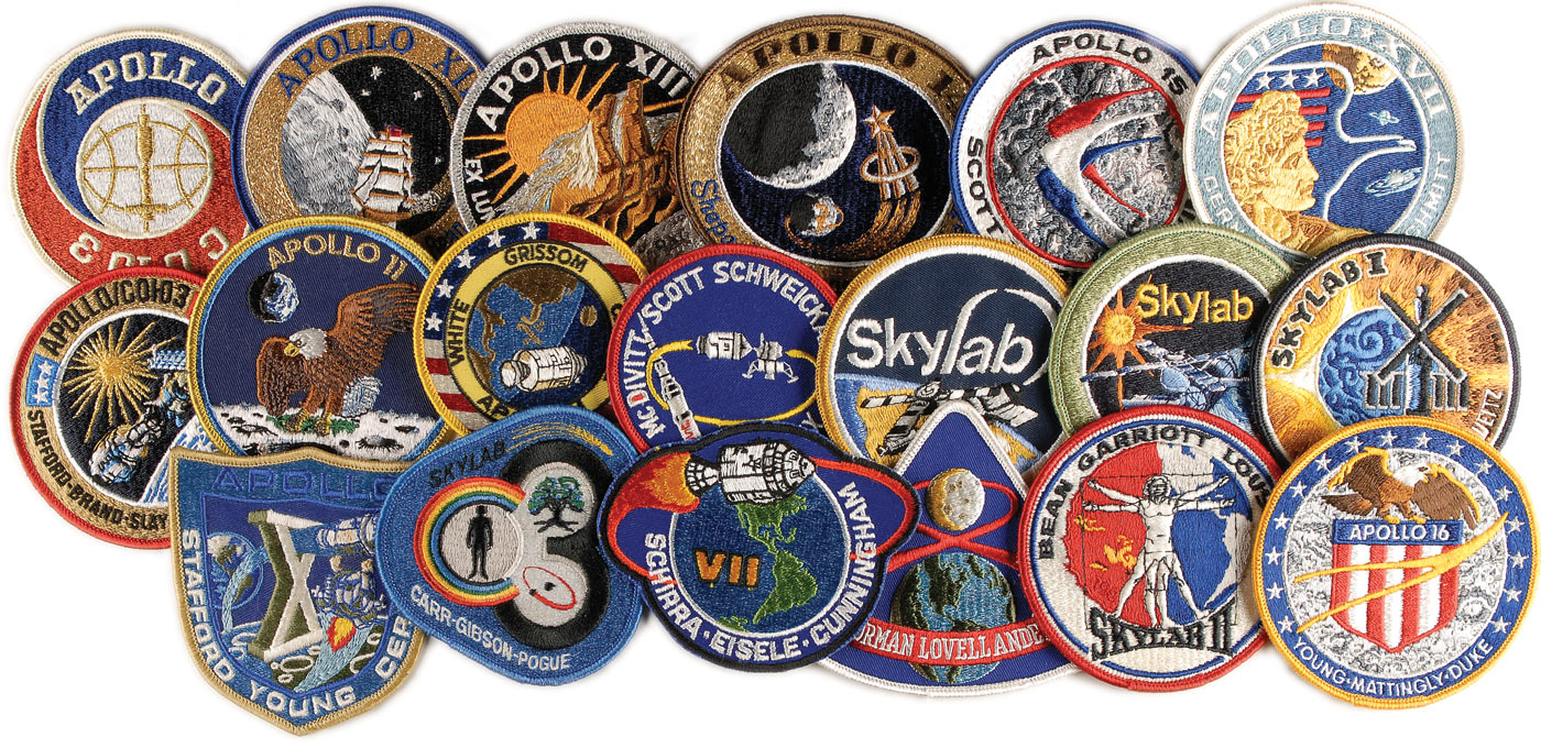 Collection of 19 souvenir mission patches, all approximately four inches in diameter from the following missions: one from each Apollo mission (I, VII–XVII), two Apollo-Soyuz; and five from Skylab.
