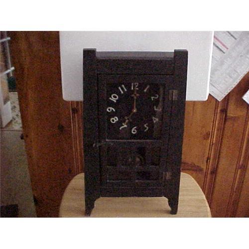 Mission shelf clock,dark oak finish, key wind, 8 day; 11.5" wide, 10.5" tall x 4.5" deep nice tone, chime, but wome work needed, (REPAIRS), LIFT LATCH DOOR FOR OPENING. A REAL ATTRACTIVE CLOCK FOR ANY SETTING, PART OF original paper lable on back, Santa Clark Co. Conn. USA; 1901 (c)