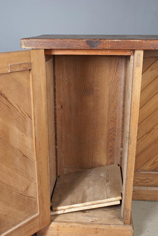 Mortise & Tenon construction with dovetailed drawers and waynescoat panels veritcal and angled, with heavy darker stained top. 40.25" H x 75" W x 19" D. Wear throughout with top with some staning and warping.