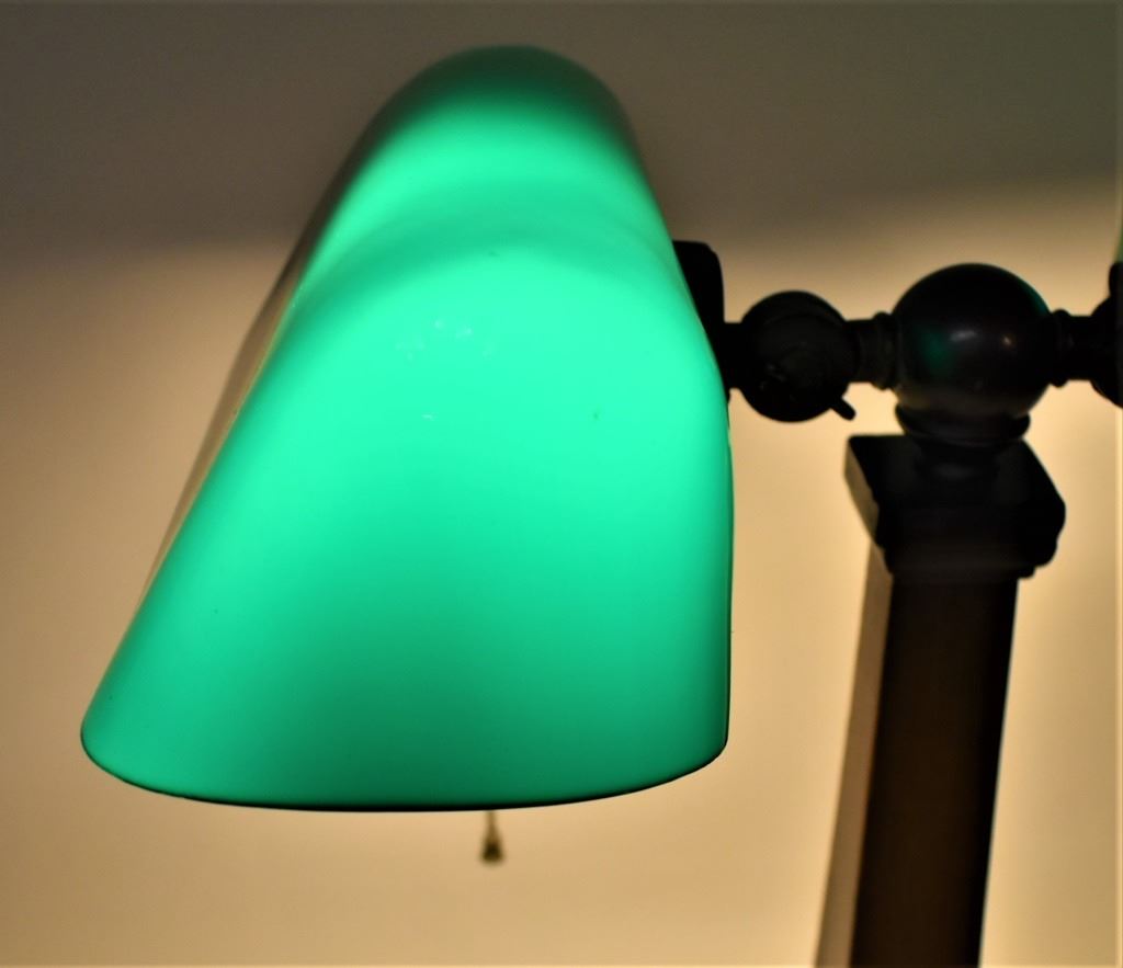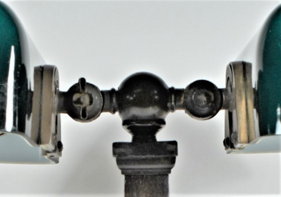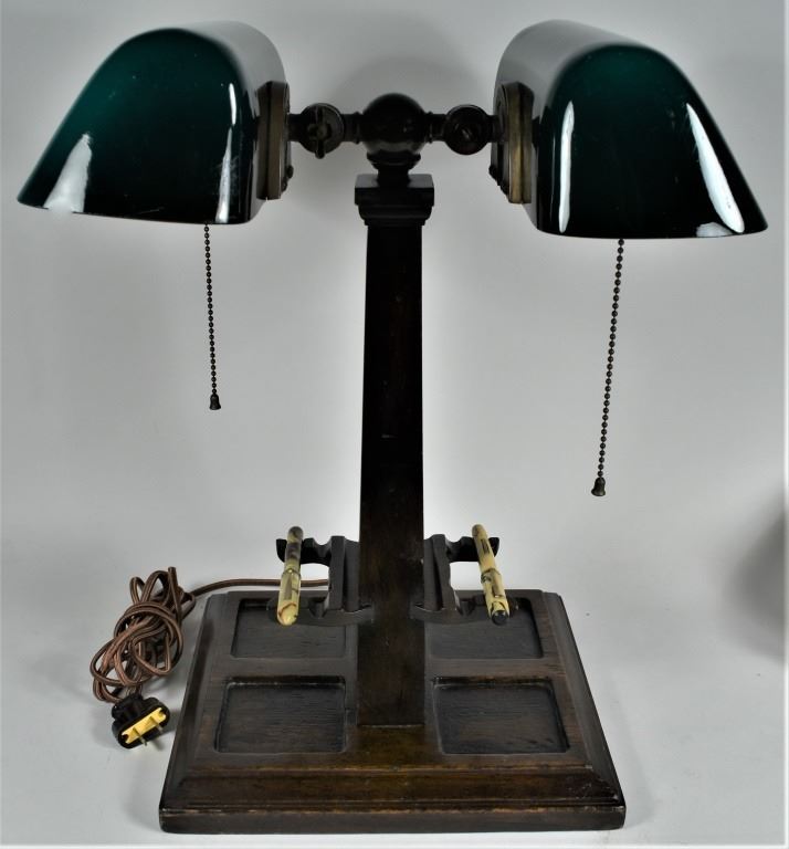 Mission Style Partners "Bankers" Desk Lamp Writing Station. Amronlite- Amron Mfg. Co. Chicago. Inkwell station in oak base with pen holders. Comes with two antique writing pens. Excellent working condition, new electrical cord for safe use. 9 1/2 X 17 X 11 inches overall.
