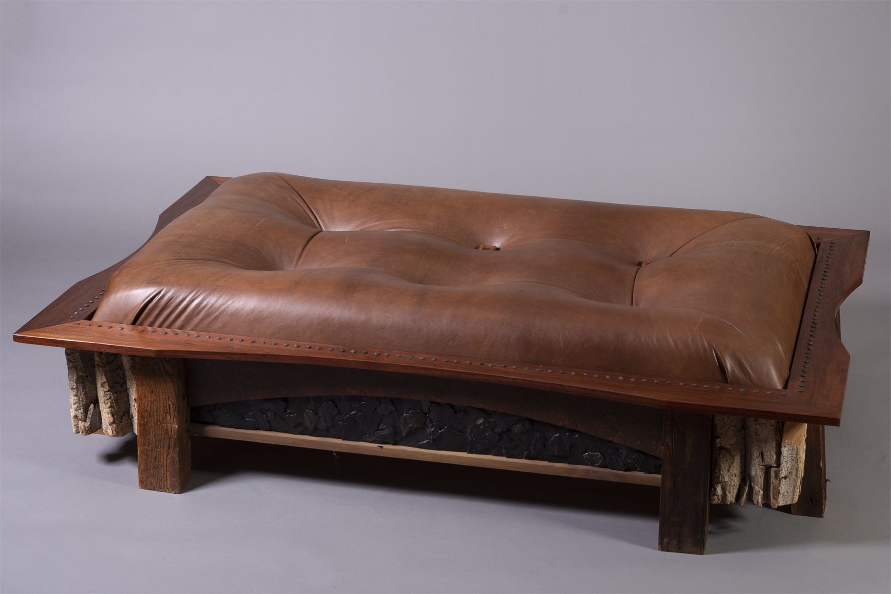 Large light brown leather with mission style wood trim with studs along top edge.
