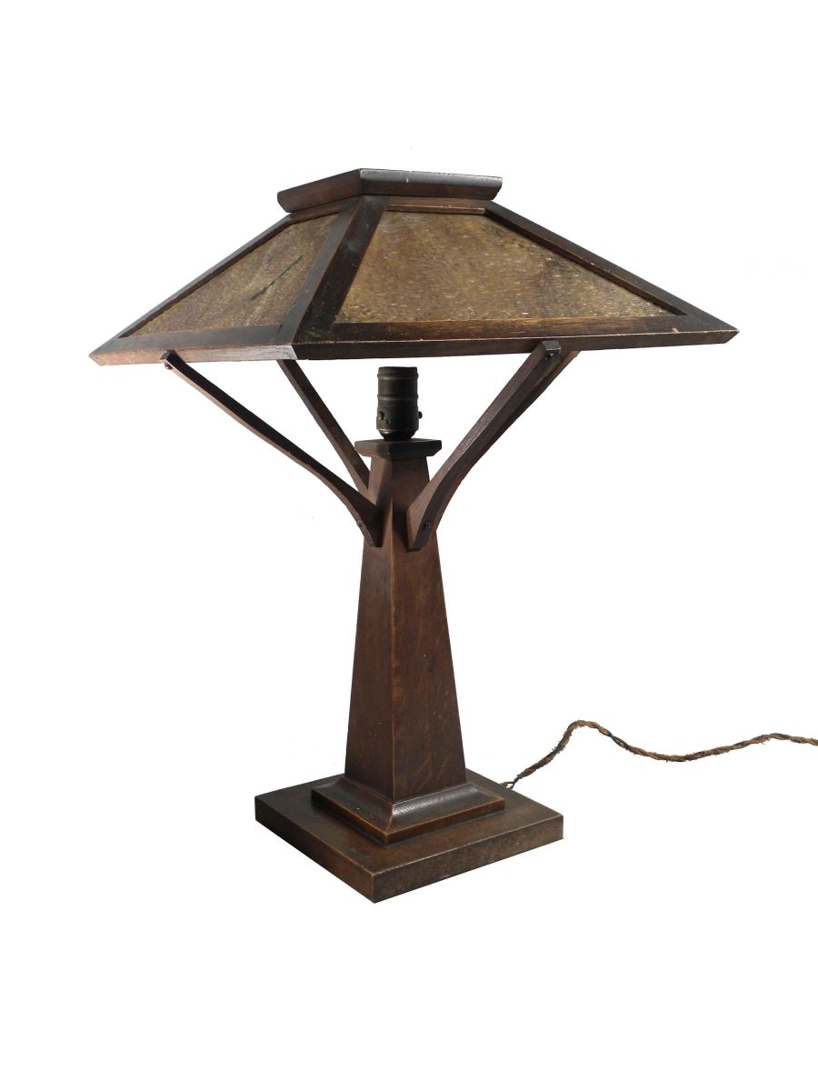 Mission Style Slag Glass/Oak Table Lamp. Good original condition. 21 inches tall.