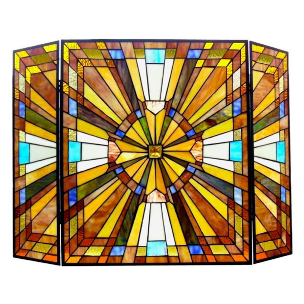 Mission-style stained art glass fireplace screen, created using 380 hand cut pieces of stained art glass & 1 glass bead, wrapped in copper foil with textured black finish. 38" W overall X 27" H overall.