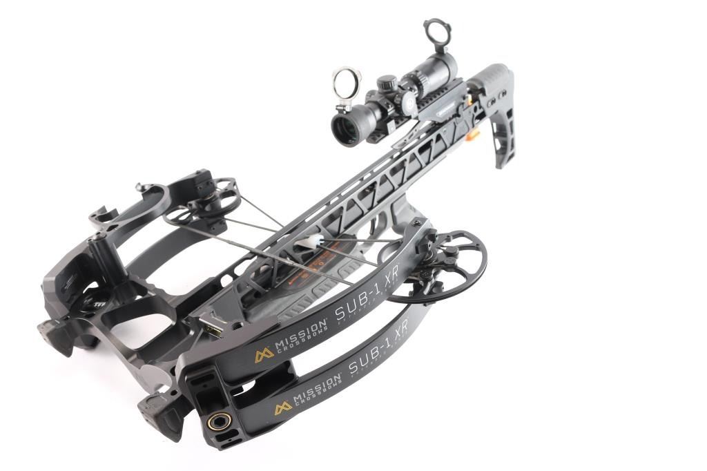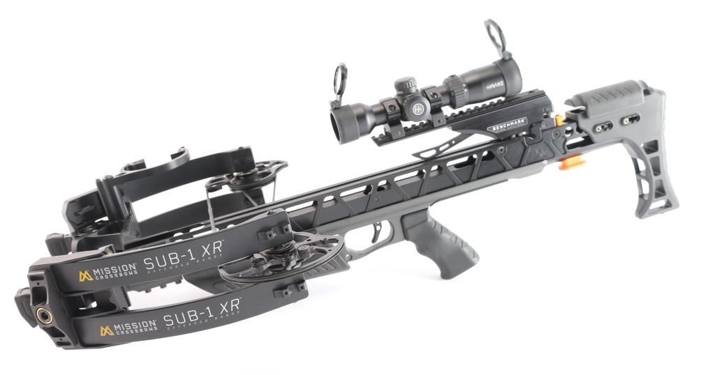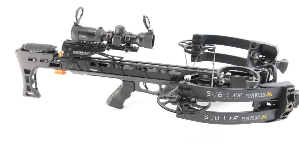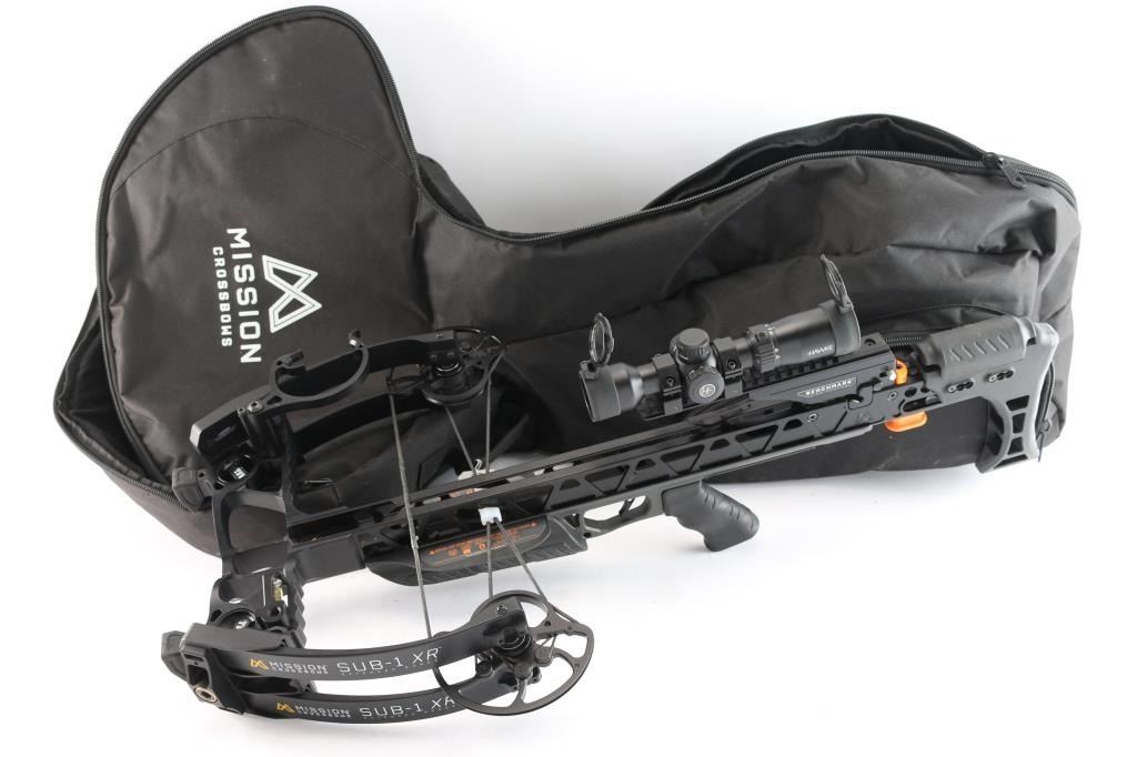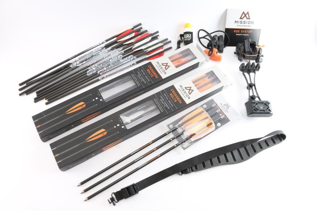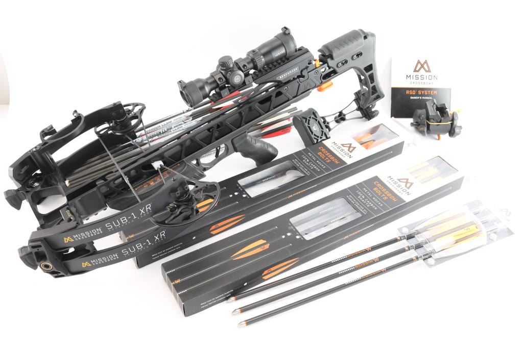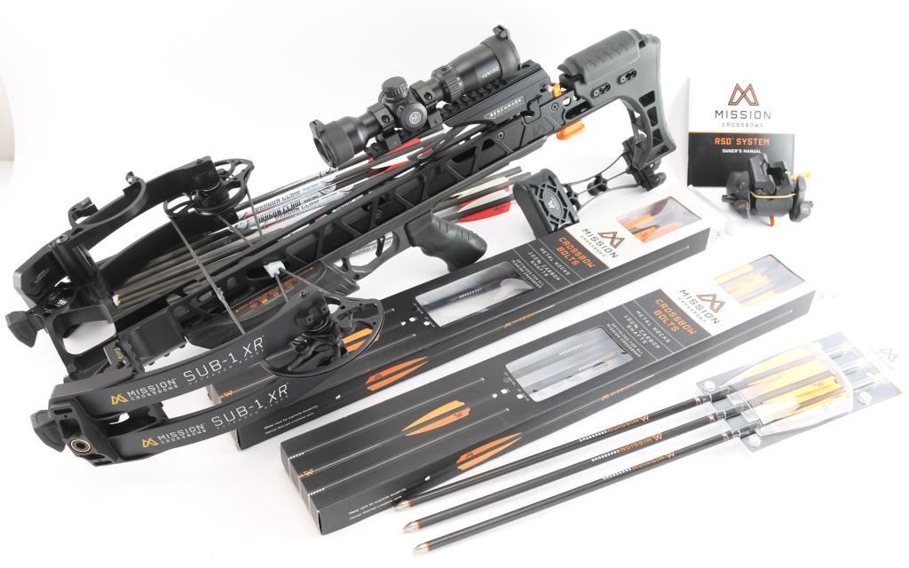 Sub-1 XR Extended Range crossbow includes: Hawke scope, bolt quiver, rail lube, soft case, (6) premium bolts, (3) Mission Lighted bolts, (12) Black Eagle "Dragon Claw" bolts, RSD cocking crank, cocking aid (rope), sling, and scope cover.