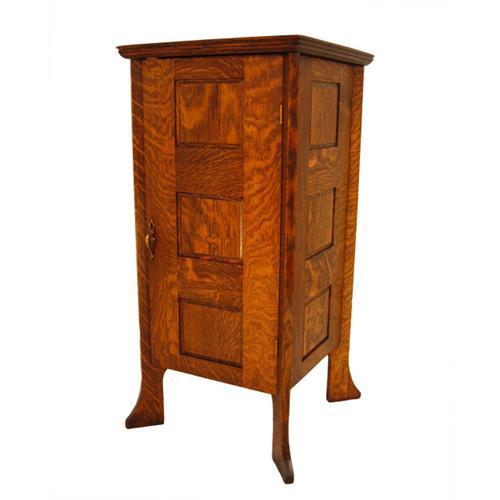 This quartered oak gentleman's bar has raised panels on all 4 sides. The inside is fitted with a revolving bottle holder and accessory rack.