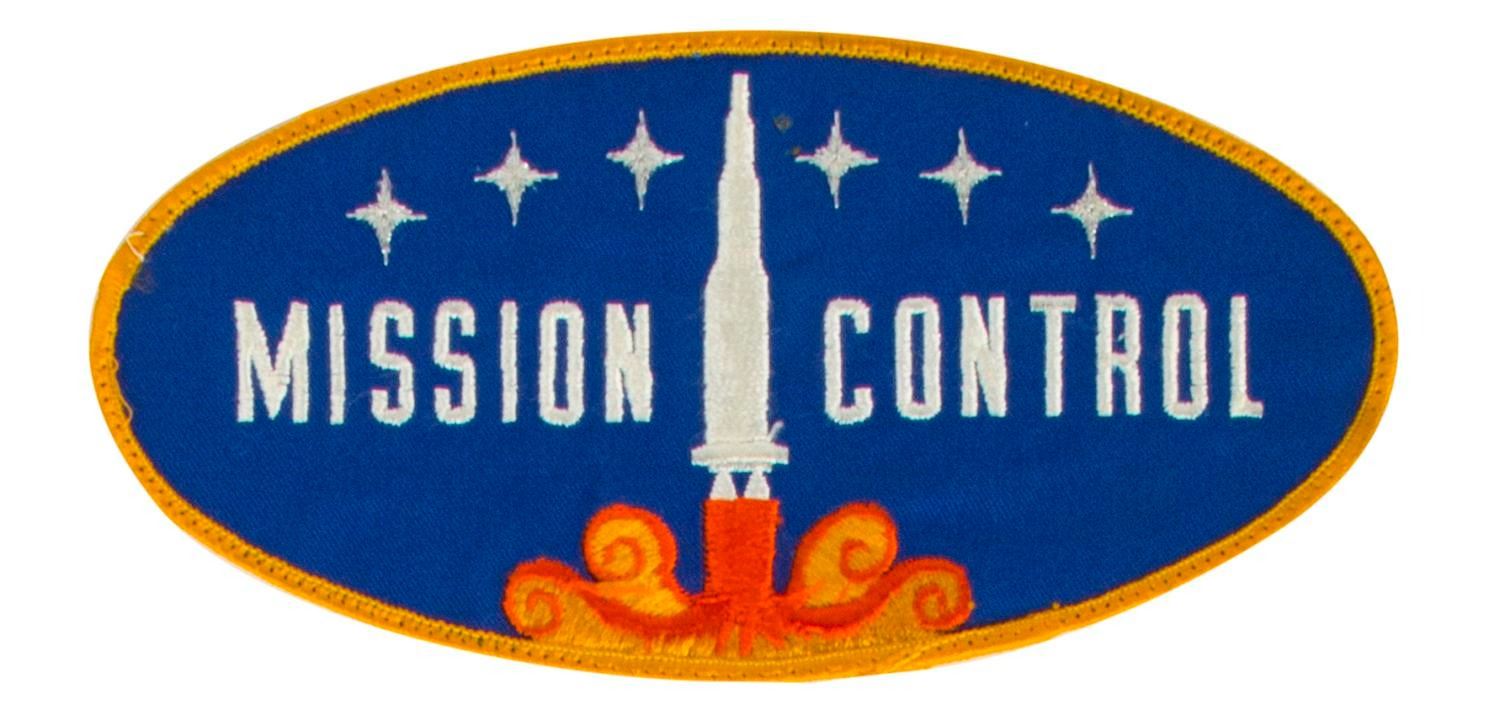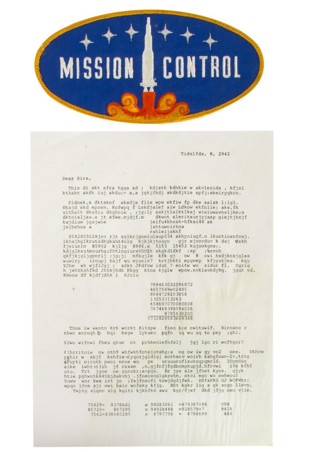 (Disneyland, 1970) An oversized and seldom seen embroidered jacket patch worn by the animatronic cast at Mission Control, and a prop document, both used in the Mission to Mars attraction. The Mission Control patch could have been seen on the backs of the animatronic character's lab coats, while the document has placeholder text throughout. The patch measures 4"x8" and the letter measures 11"x8.5". The pair is in very good condition with some handling wear.