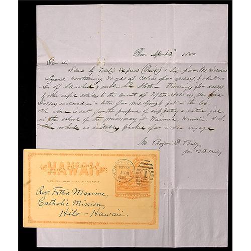 <Our item number 140046><B>Missionary Letters - 1850 and 1895.</B> Autograph letter from Mrs. Benjamin D. Bailey of Providence, 1p, 9¾ x 7¾ in., 1850, April 3. To Henry Hill, Missionary House, Boston, sending calico, bleached muslin, and other useful articles, plus five dollars, all "for the purpose of supporting a native girl in the school of the missionary at Waimea, Hawaii, S.I…." Letter is fine; address is smeared. With a postcard in French addressed to Rev. Father Maxime of the Catholic Mission in Hilo, Hawaii, from fr[ère] Corneille in Honolulu, 1895, May 14. Giving permission and saying R.P. Léonore hasn't yet told him anything about going to Hilo. <BR>Estimated Value $300 - 400. <BR><BR>Our item number 140046<BR><IMAGES><P ALIGN="CENTER"><IMG SRC="http://www.goldbergcoins.net/liveauction/49jpegs/140046.jpg"> </P></IMAGES>